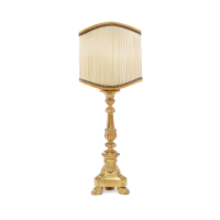 Legno intagliato e dorato, fusto a balaustro con decori fogliacei, base tripode con ghirlande e serti d'alloro, su piedi ferini, elettrificato.