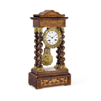 Cassa architettonica con trabeazione modanata e cimasa sagomata, decorata da raffinati motivi fitomorfi a intarsio. Quadrante in smalto bianco con numeri romani, movimento con scappamento ad ancora, sospensione a lamella (mancante), suoneria delle ore e mezze ore al