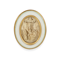 Placca in gesso dipinto, entro cornice ovale dipinta e dorata con vetro bombato.