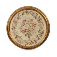 Coppia di ricami a piccolo punto su tessuto con composizioni floreali, entro cornici tonde modanate in legno dorato.