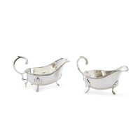 Comprendente dodici forchette e dodici coltelli grandi, dodici cucchiai, dodici forchette e dodici coltelli da frutta, dodici cucchiai da frutta, dodici forchettine e dodici cucchiaini da dessert e sette posate da portata, entro custodia in legno sagomata a due piani.