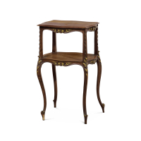 Legno intarsiato e parzialmente dorato, piano sagomato e ripiano inferiore, gambe mosse riunite da traversa, decorate con motivi fogliacei in bronzo dorato.