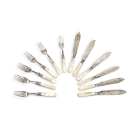 Composto da sei forchette e sei coltelli con manici lisci in madreperla, lame con decoro inciso.