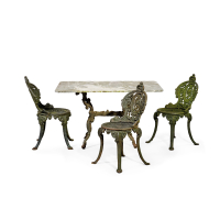 Ghisa, i tavoli con piani ottagonali in marmo chiaro, composto da una panchina, due tavolini con piano in marmo e tre sgabelli. Un tavolo diverso.