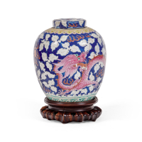 Porcellana modellata in leggeri sgusci e dipinta a smalti policromi e tocchi di oro, fondo rosa e decoro di draghi all'inseguimento della Perla in volo tra nuvole e dardi, in basso onde stilizzate, tra spalla e collo due draghi in accentuato rilievo, su base in legno.