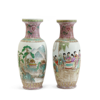 Porcellana dipinta a smalti policromi, il primo raffigurante un decoro con figure femminili e paesaggi, il secondo presenta un fine decoro di paesaggio lacustre con padiglioni e figure, il collo di ambedue con motivi floreali; entrambi presentano un marchio al centro