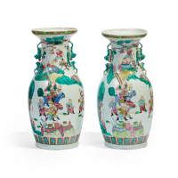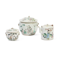 Porcellana dipinta a smalti policromi, decoro di figure nel paesaggio, le anse modellate come coppia di leoni buddhisti accucciati che si affrontano.
