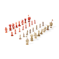 Osso intagliato, inciso e inchiostrato, i due personaggi raffigurati seduti su di un trono, vestiti di abiti sfarzosi e con al petto una collana a sfere, l'imperatore con uno scettro ruyi nella mano sinistra, l'imperatrice con un piccolo dono in quella destra.