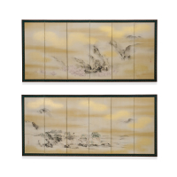 Inchiostro, colori tenui e oro su carta, nel formato della coppia di paraventi pieghevoli a sei ante, entrambi firmati con sigillo.