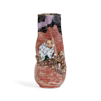 Ceramica di tipo "Sumidagawa" con invetriatura policroma, la sezione superiore a profilo irregolare, modellato a sgusci paralleli orizzontali, nella zona inferiore due figure in accentuato rilievo, marchio entro ovale verso la base.