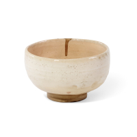 Ceramica di tipo Raku con rivestimento bianco, un restauro kintsugi a lacca dorata.