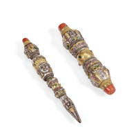 Argento parzialmente dorato con inserti di pietre, gli estremi del vajra e finale del phurba con inserti in corallo.