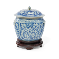 Porcellana 'bianco e blu', il decoro consiste del carattere shou ("lunga vita") su tappeto floreale, anse modellate come due leoni buddhisti accucciati che si affrontano.