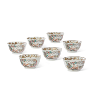 Porcellana dipinta a smalti policromi e oro; ciascuna tazzina su un lato presenta una scena di chiaro gusto europeo, con una dama e un Cupido entro una cornice di fogliame rococò, mentre sull’altro lato reca una composizione floreale.