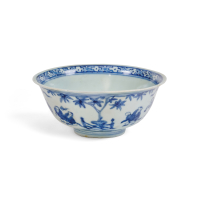 Porcellana 'bianco e blu', decorata sull'esterno con motivi geometrici e floreali.