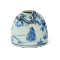 Porcellana 'bianco e blu', sul corpo decoro di figure nel paesaggio, sulla spalla un draghetto chilong in accentuato rilievo.
