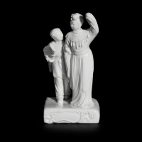 Porcellana, raffigurante una figura femminile stante accompagnata da bambino, entrambi su basamento.