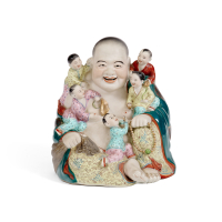 Porcellana con decoro a smalti policromi, la divinità buddhista raffigurata seduta, nella mano sinistra un rosario e in quella destra un lembo del sacco, cinque bambini si arrampicano sul suo corpo.