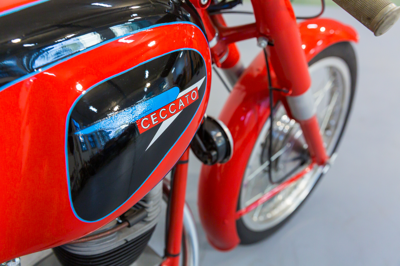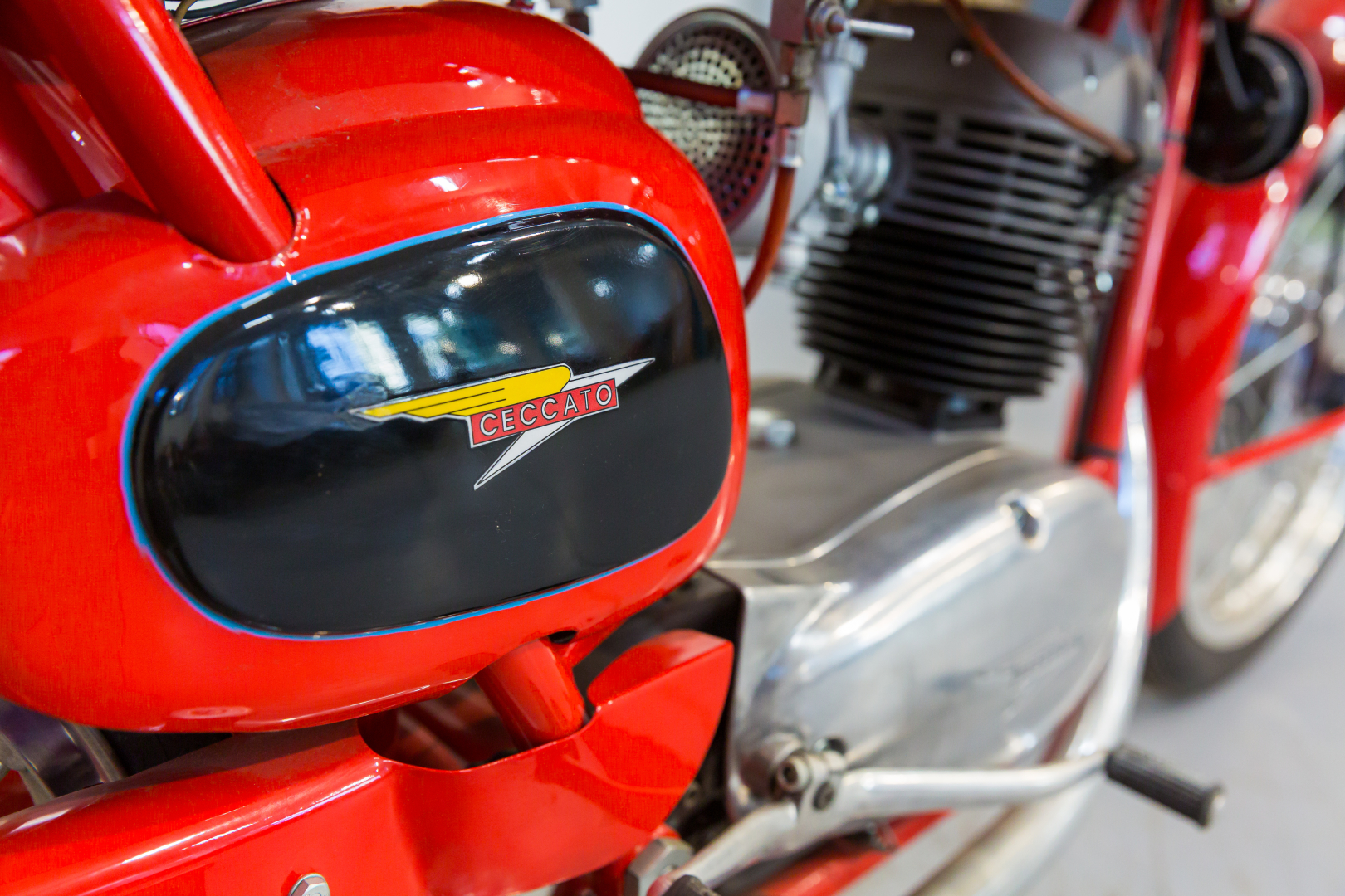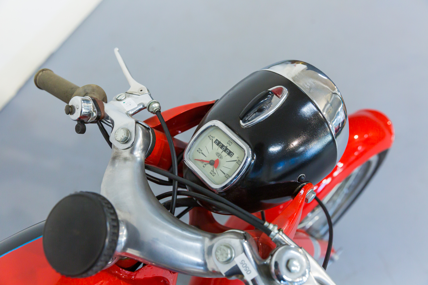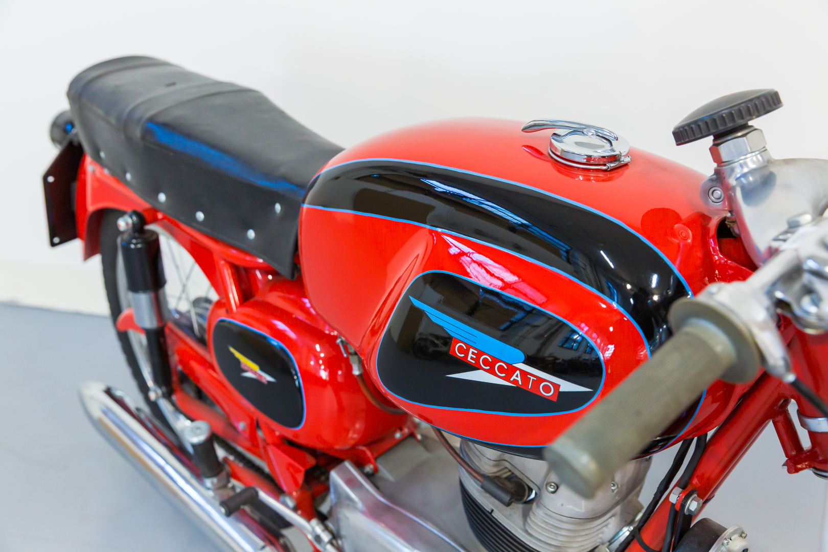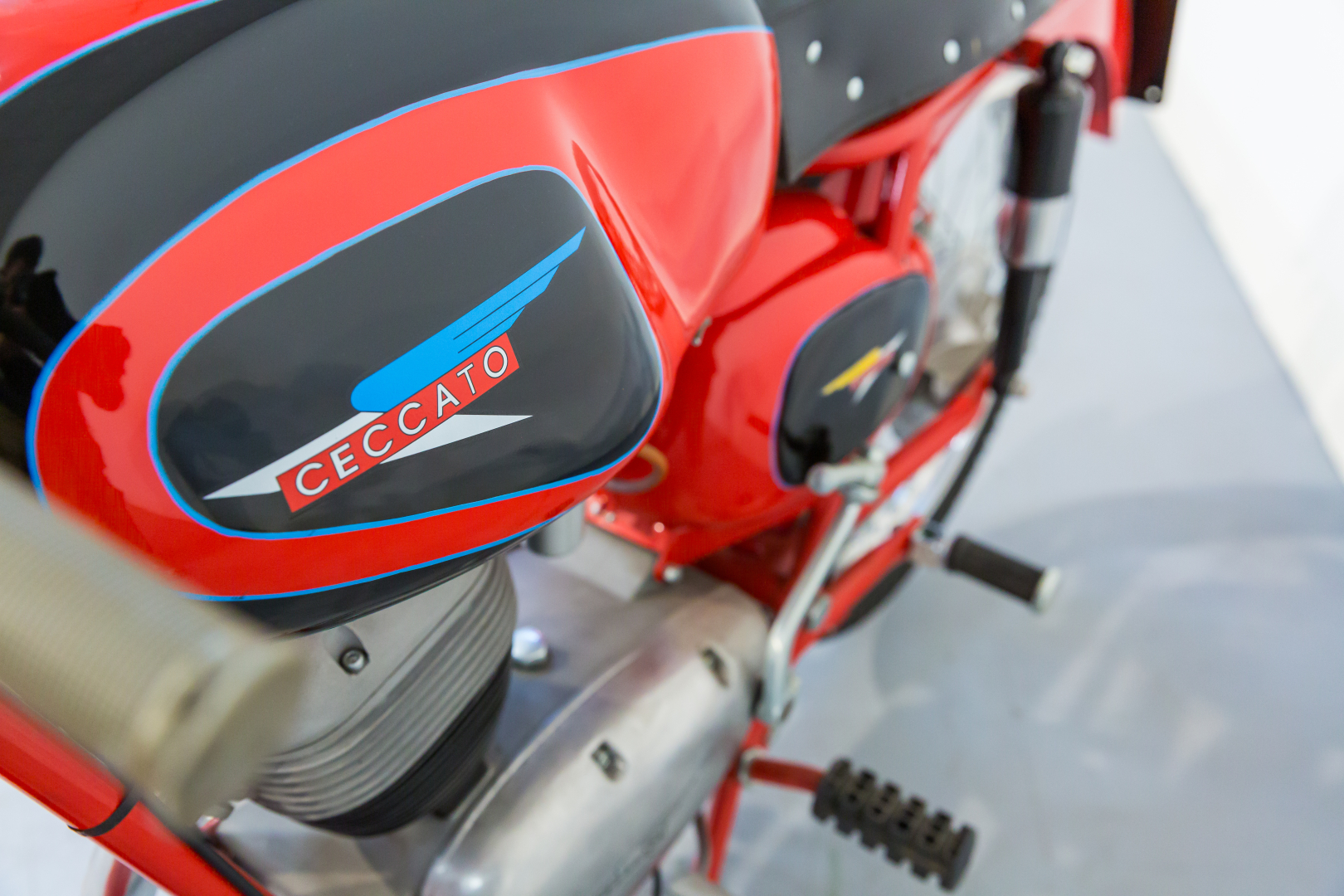 La Ceccato & C S.p.A., forte dei successi commerciali nel settore dei ciclomotori e motociclette nella seconda parte degli anni ’50, presenta il modello di 150 cc. Il 150 GT era dotato di un motore monocilindrico a 4 tempi da 150 cc con distribuzione ad aste e bilancieri che, coadiuvato da una ciclistica generosa, con telaio a semi doppia culla in tubi d’acciaio, forcella telescopica e forcellone oscillante con due ammortizzatori telescopici, ruote da 19” e freni a tamburo, lo fecero diventare una piacevole motoleggera. Restaurata, in ottime condizioni. Si consiglia un controllo generale prima dell’utilizzo.