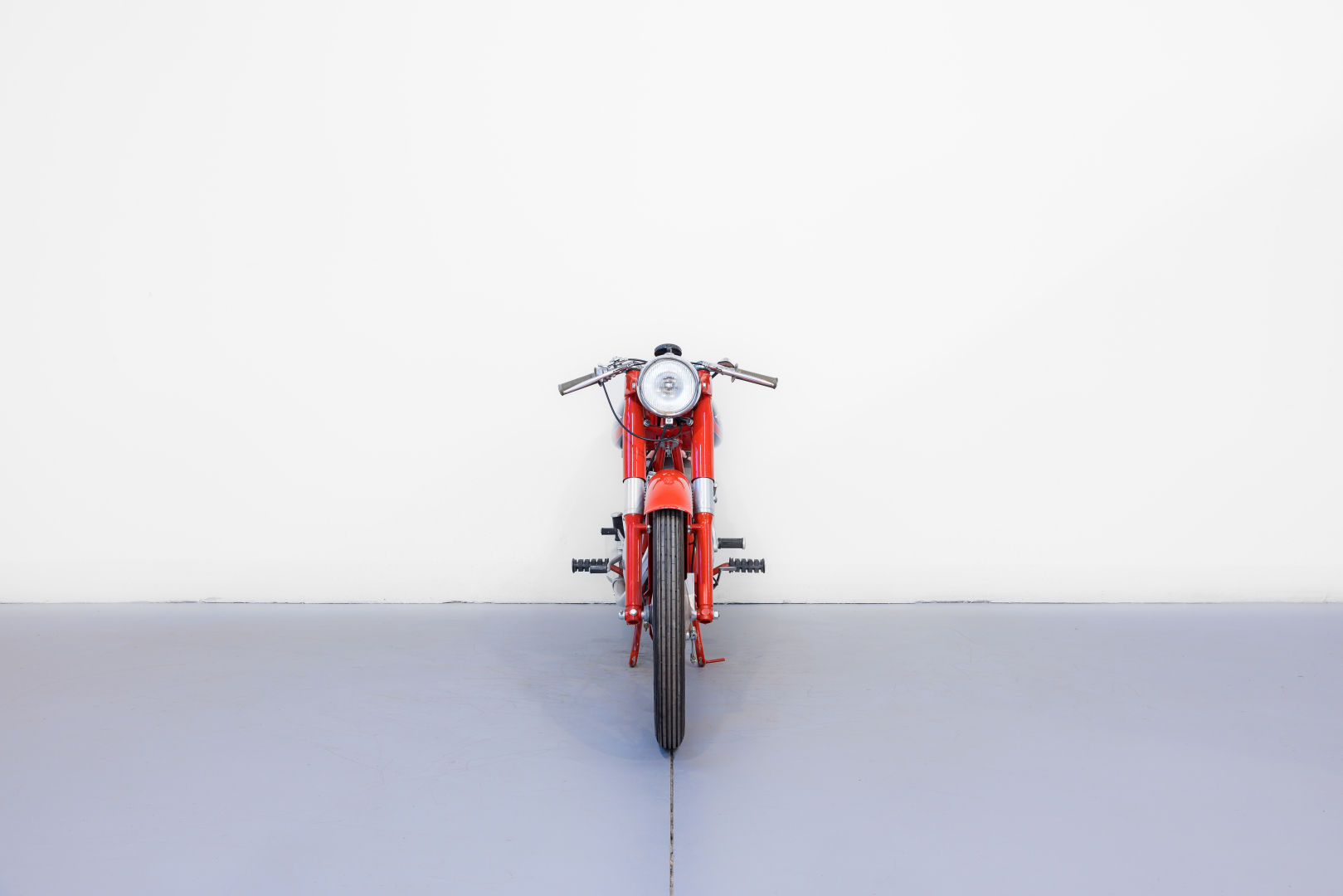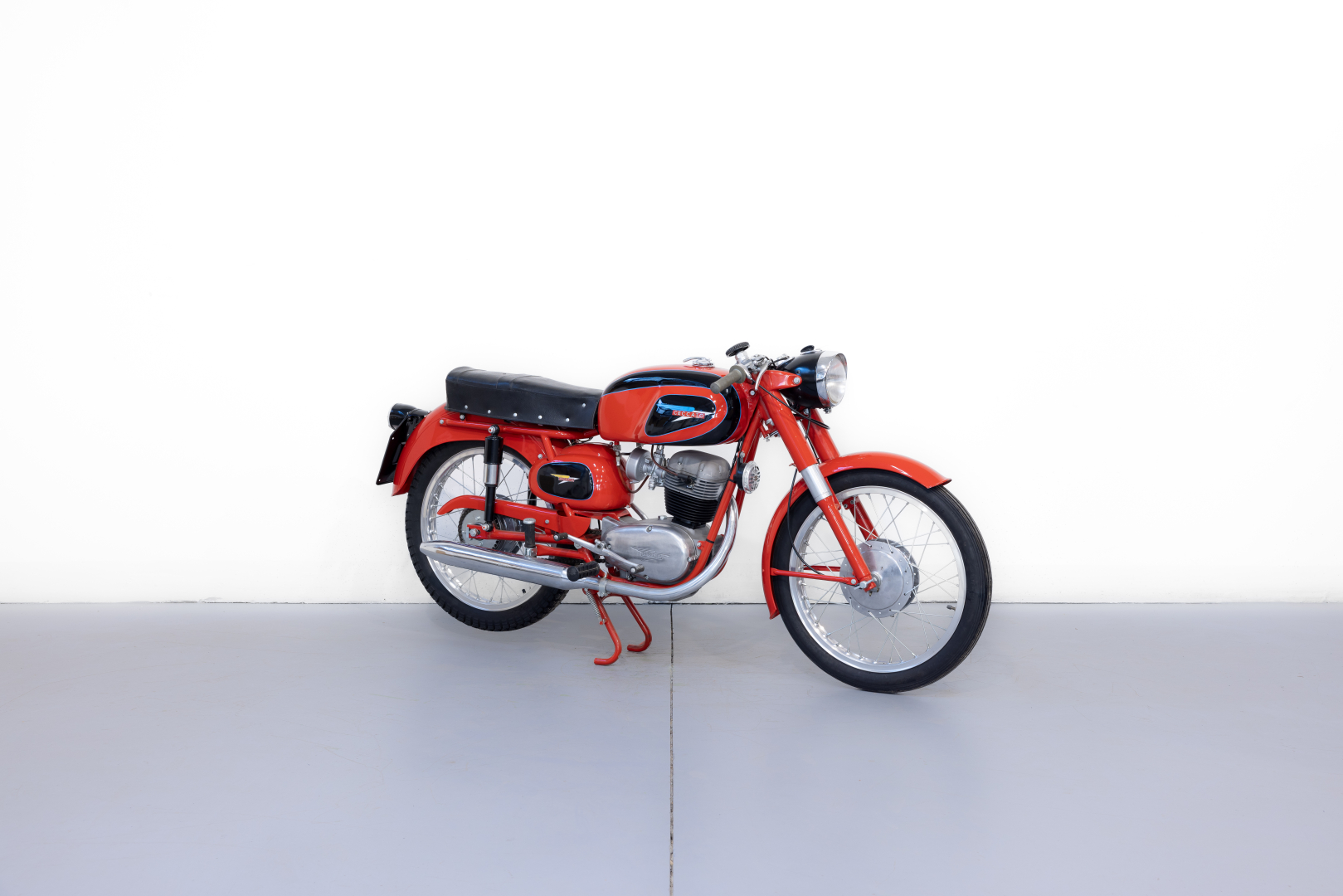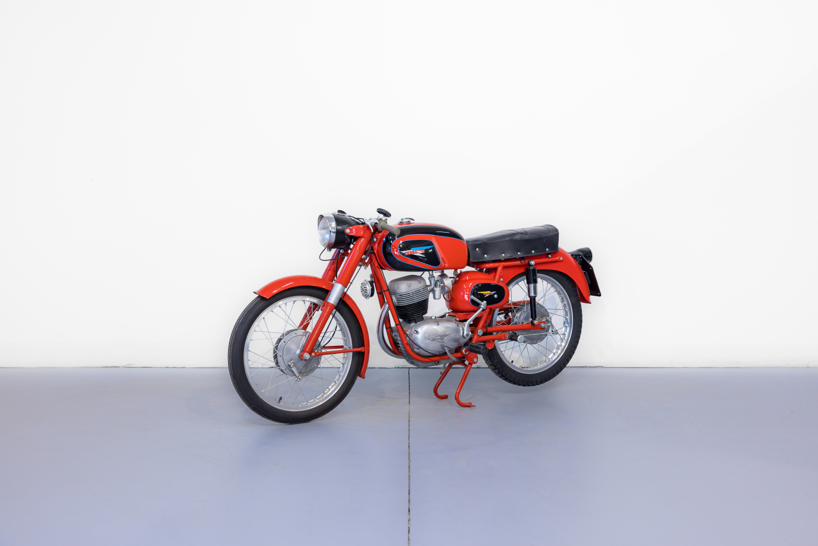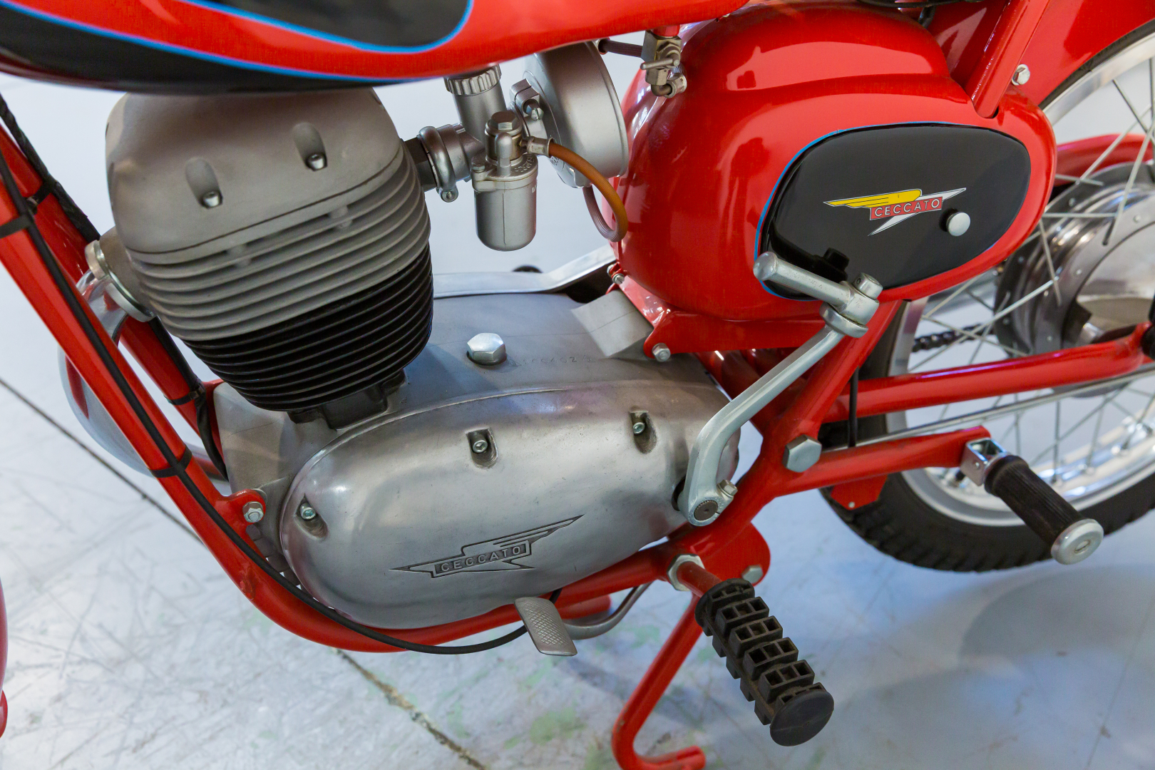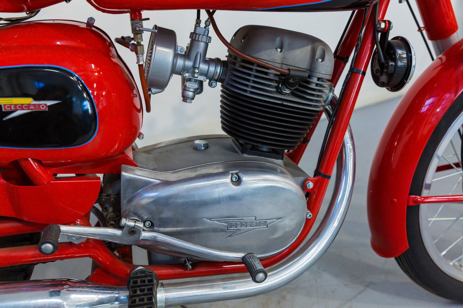 La Ceccato & C S.p.A., forte dei successi commerciali nel settore dei ciclomotori e motociclette nella seconda parte degli anni ’50, presenta il modello di 150 cc. Il 150 GT era dotato di un motore monocilindrico a 4 tempi da 150 cc con distribuzione ad aste e bilancieri che, coadiuvato da una ciclistica generosa, con telaio a semi doppia culla in tubi d’acciaio, forcella telescopica e forcellone oscillante con due ammortizzatori telescopici, ruote da 19” e freni a tamburo, lo fecero diventare una piacevole motoleggera. Restaurata, in ottime condizioni. Si consiglia un controllo generale prima dell’utilizzo.