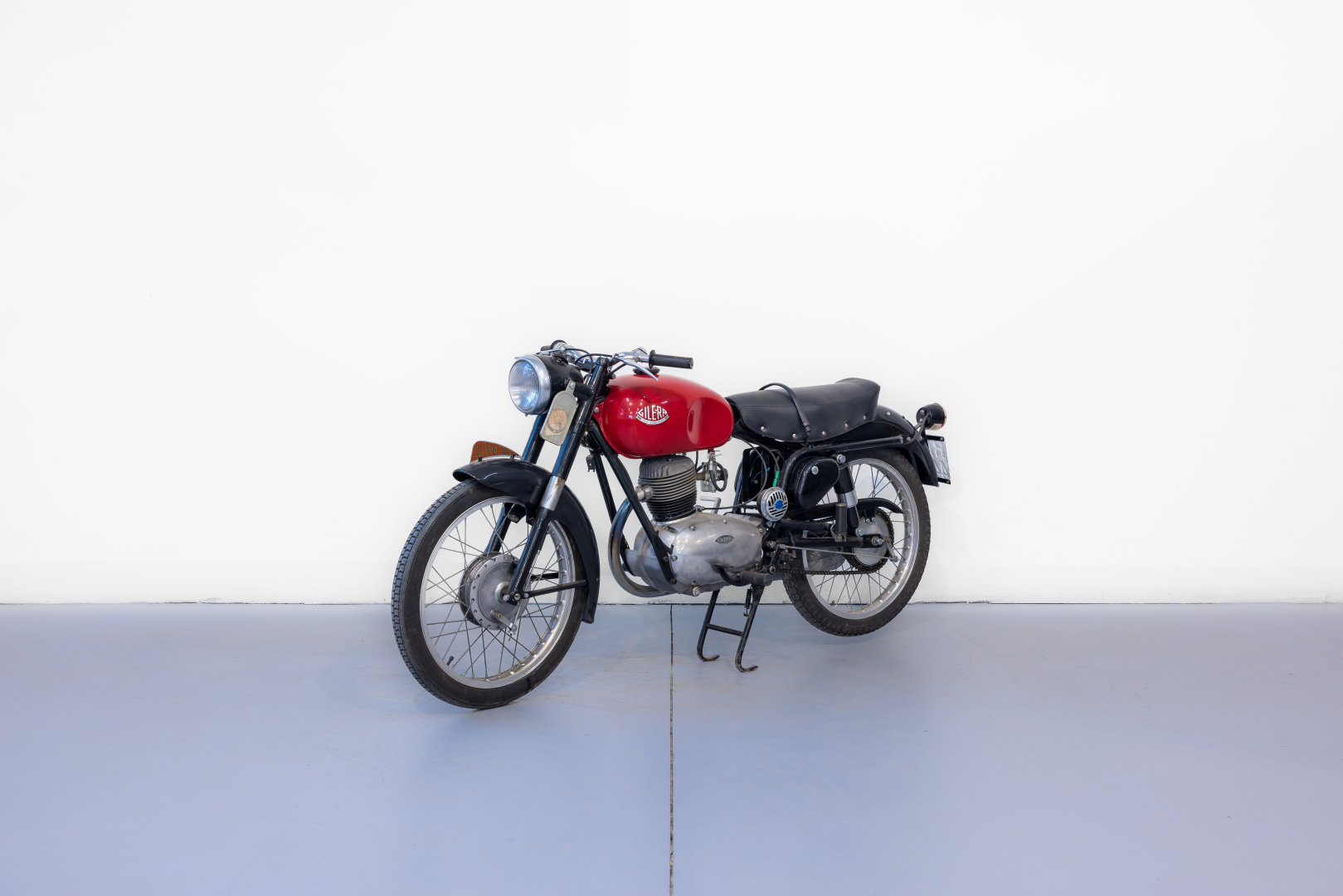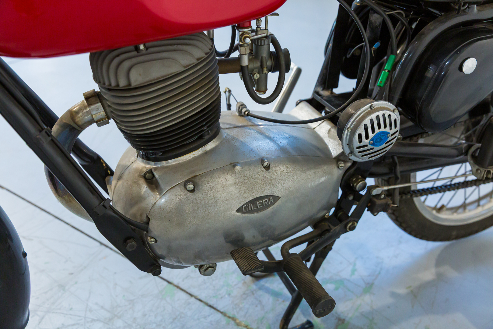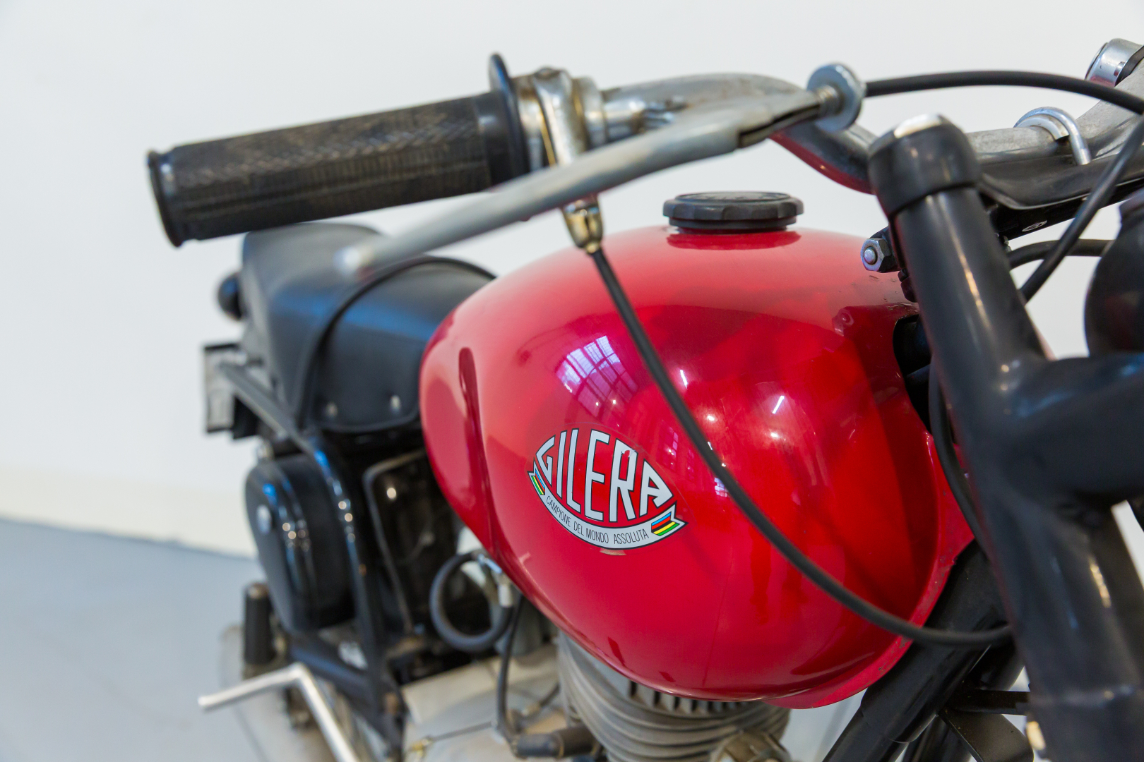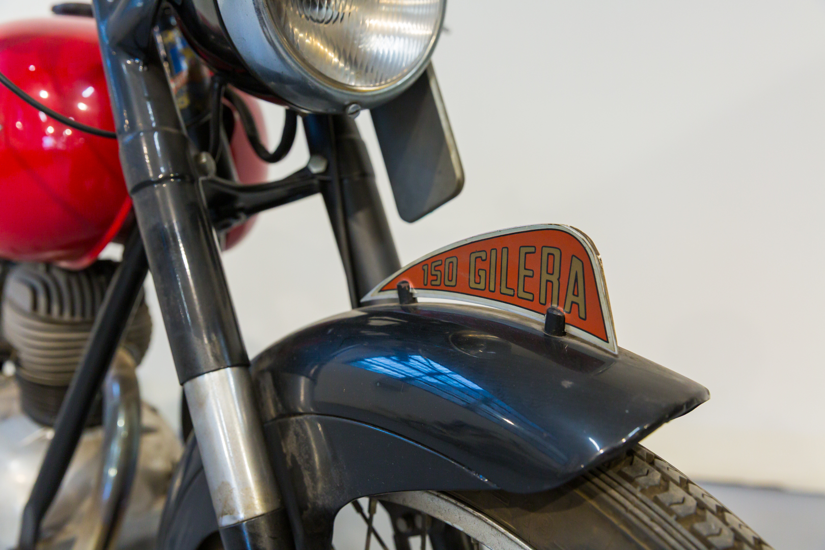 Nell’immediato dopoguerra era fortissima la domanda di motorizzazioni di tutti le tipologie e le case motociclistiche non si fecero sfuggire questa importante occasione. Gilera scese in campo dapprima con una 125, monocilindrica a 4 tempi, con forcella stampata ed ammortizzatori posteriori a compasso, pratica, economica, affidabile, assai gradita all’utenza, al punto tale da convincere i vertici aziendali a presentare, nel 1952, il modello 150 cc– ottenuto maggiorando l’alesaggio del motore 125cc da 54 a 60mm che riscosse un buon successo commerciale anche grazie agli aggiornamenti delle sospensioni, dotandola di forcella telescopica all’anteriore ed al posteriore di un forcellone oscillante con una coppia di ammortizzatori teleidraulici. Completa, in buono stato di conservazione. Si consiglia un controllo generale prima dell’utilizzo.