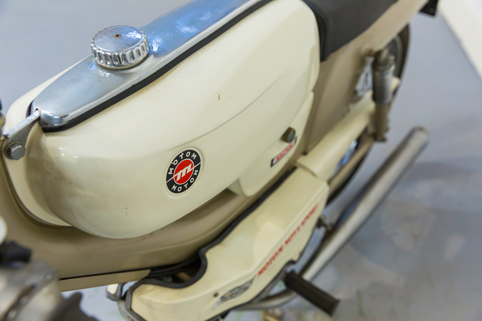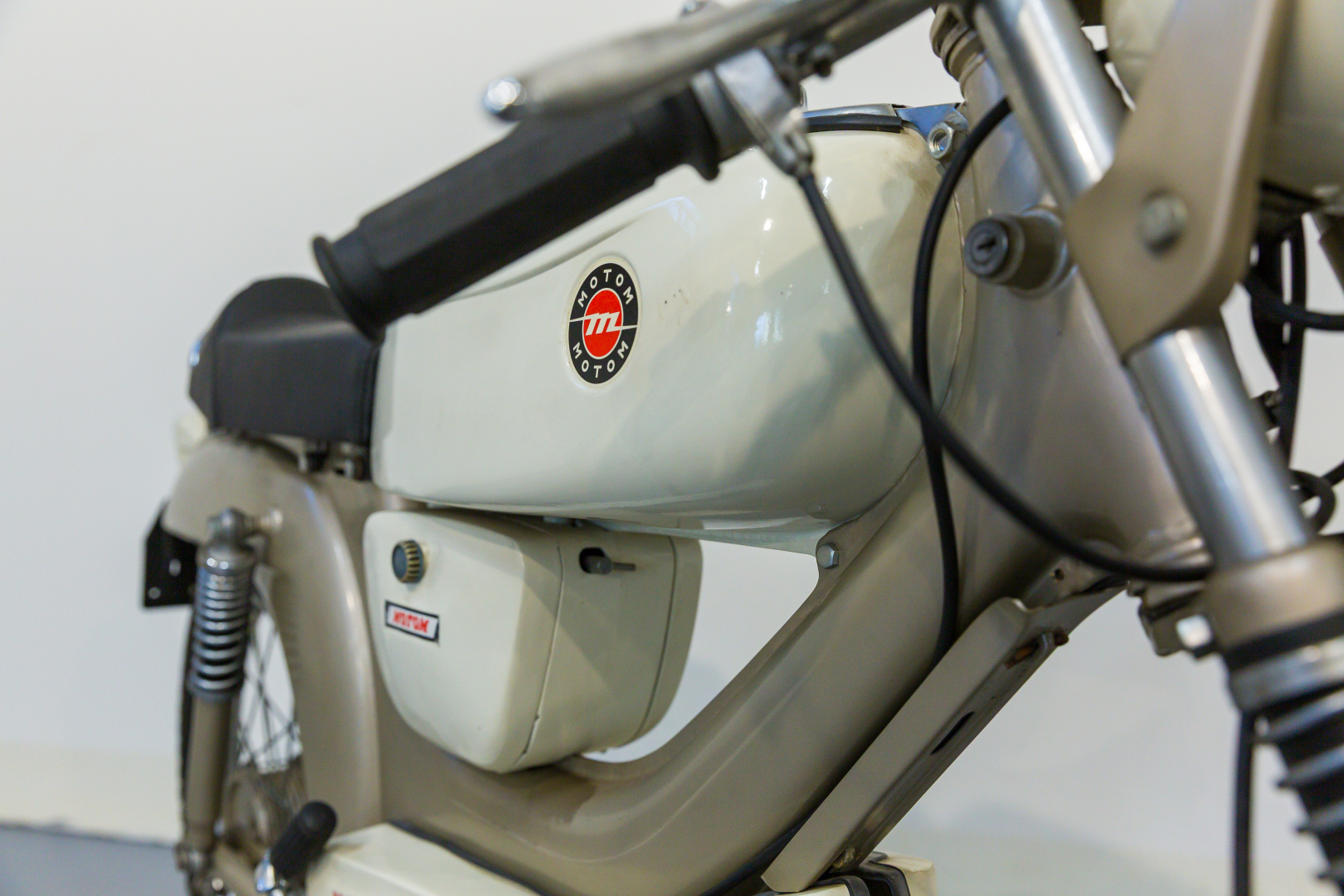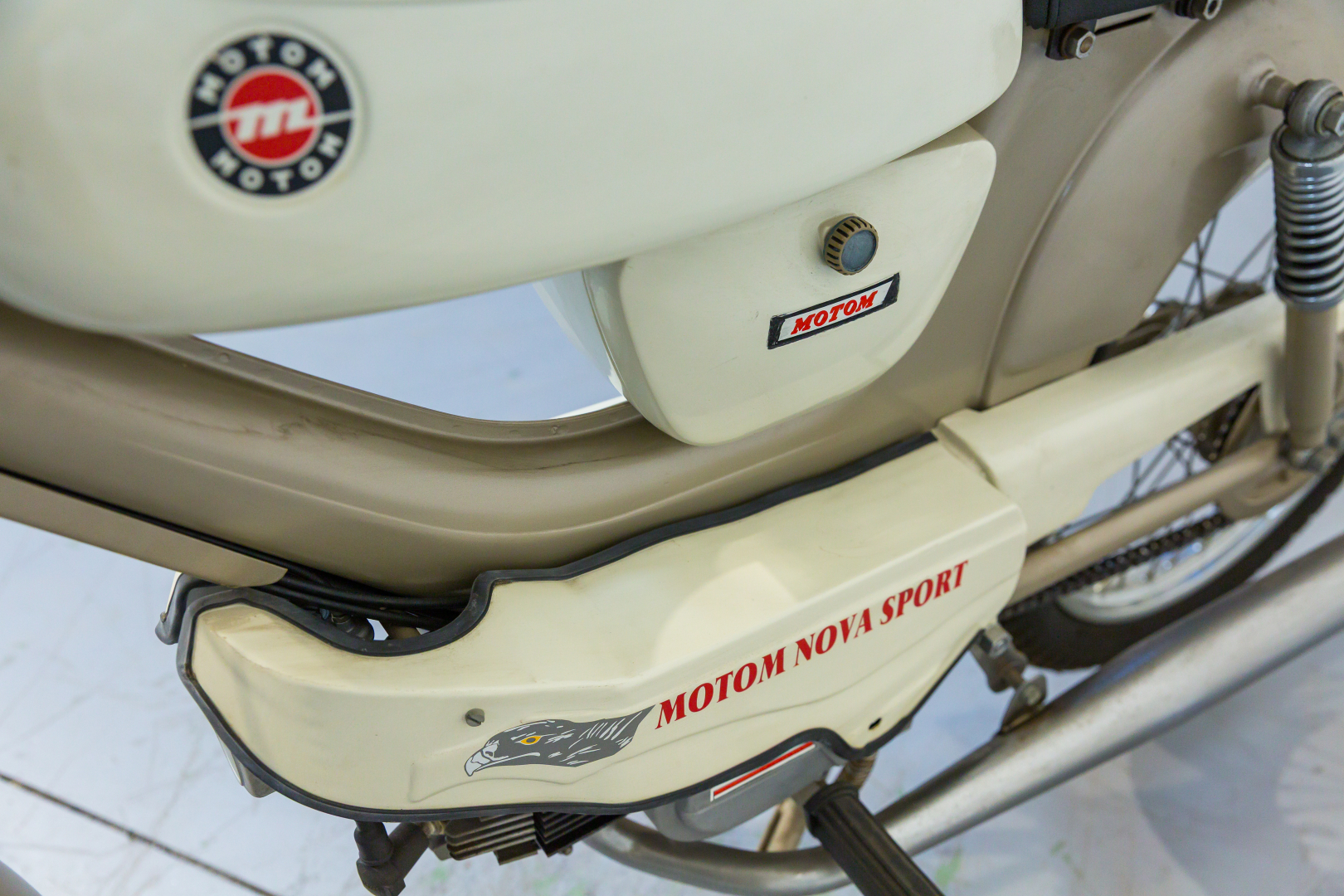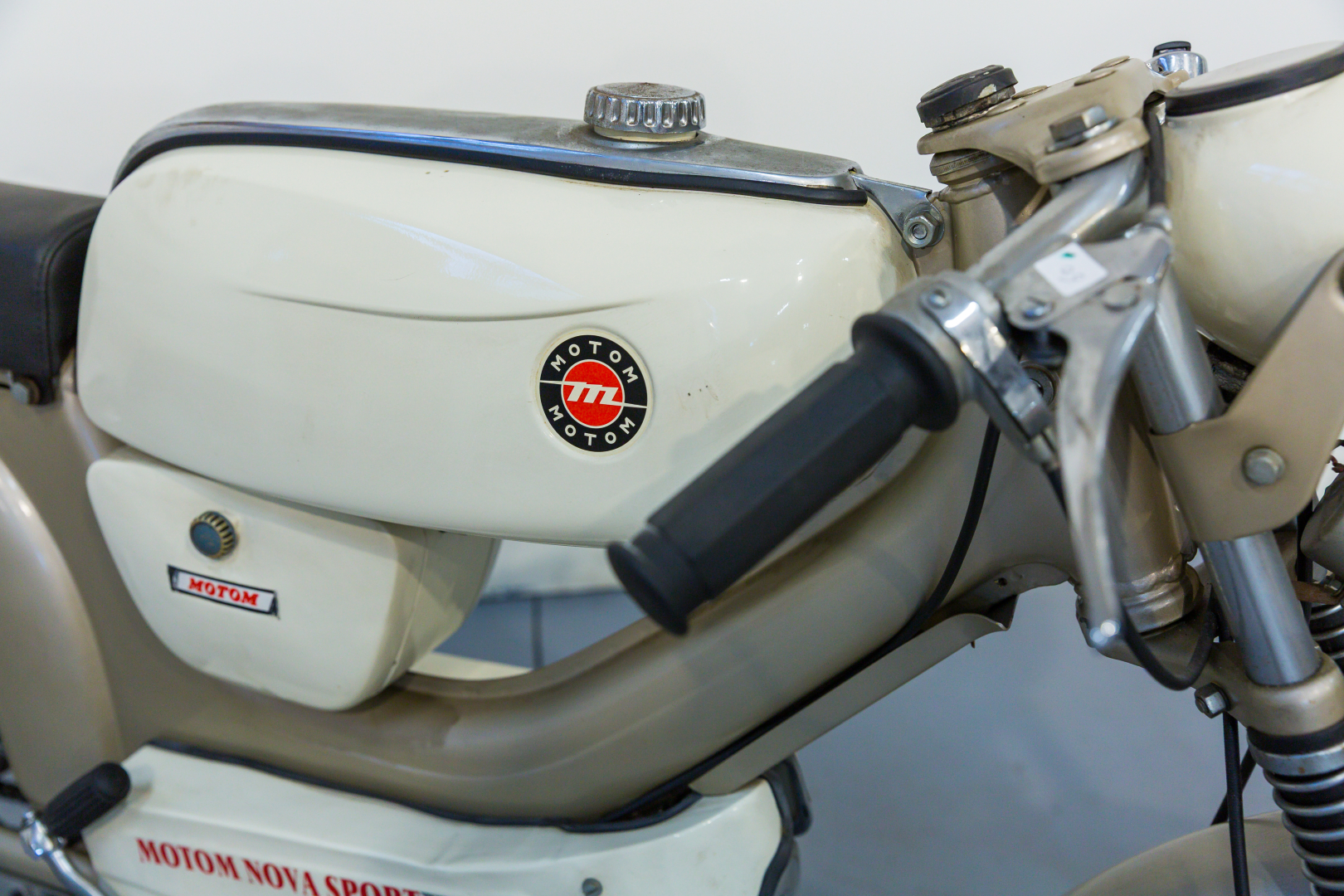 La Motom viene fondata nel 1945 a Milano, per opera della famiglia De Angeli Frua spinta dalla volontà di diversificare le proposte produttive oltre agli impianti di lavorazione tessile. Dopo la serie di ciclomotori a 4 tempi con telaio in lamiera stampata che riscossero un grandissimo successo commerciale, verso la fine degli anni ‘60, per restare al passo con le richieste del mercato, presentò un ciclomotore denominato Nova 48 Sport, dotato di motore monocilindrico a 2 tempi con cilindro disposto orizzontalmente con cambio a tre rapporti comandato a manopola. Molto rara. Conservato, completo, in ottime condizioni. Si consiglia un controllo generale prima dell’utilizzo.