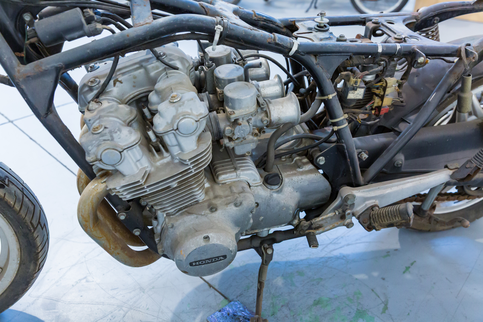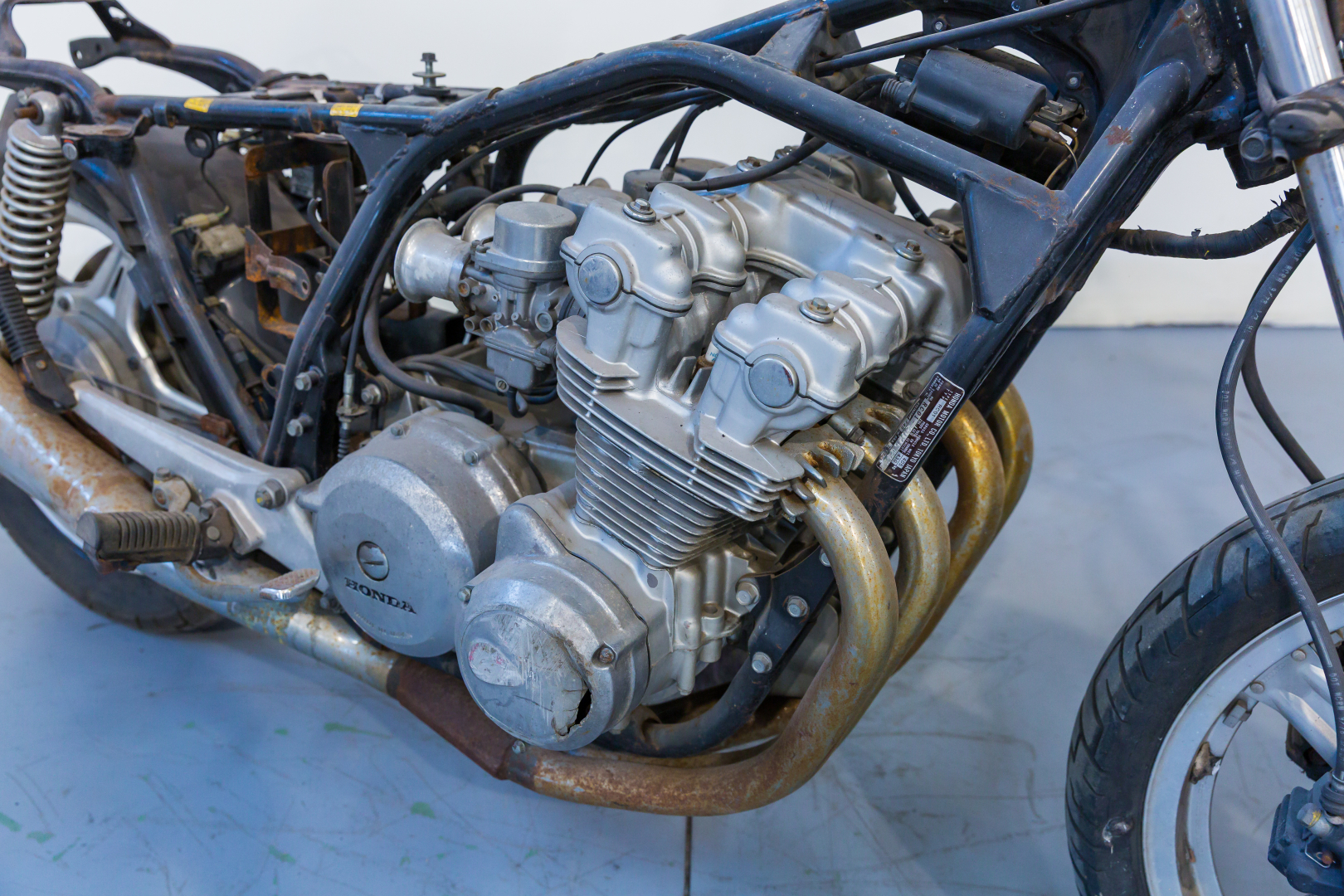 Complessivo formato da Honda modello CB 750 K, motore 4 cilindri frontemarcia a 4 tempi di 750cc con distribuzione a doppio albero a camme in testa, telaio in tubi di acciaio, ruote in lega leggera. Sprovvista delle sovrastrutture quali sella, serbatoio e parafango anteriore. Adatta uso ricambi.