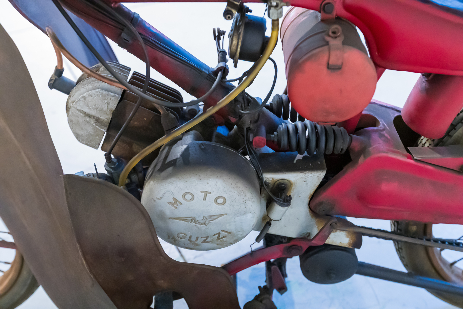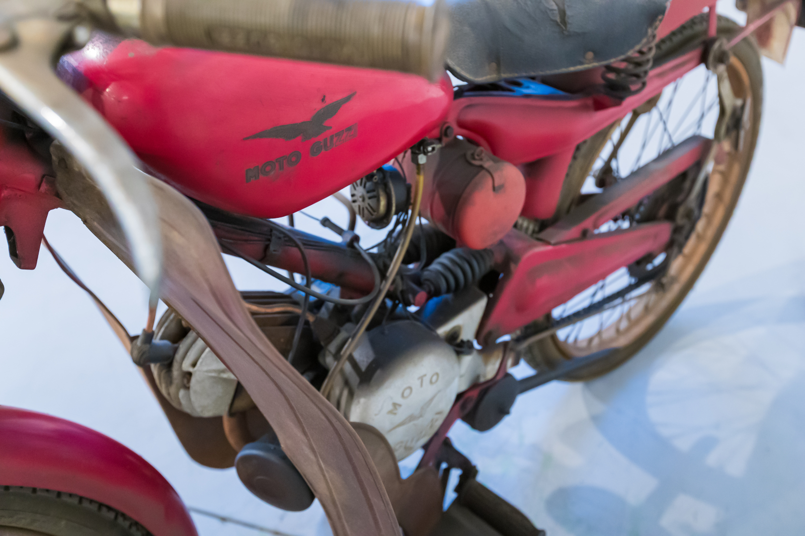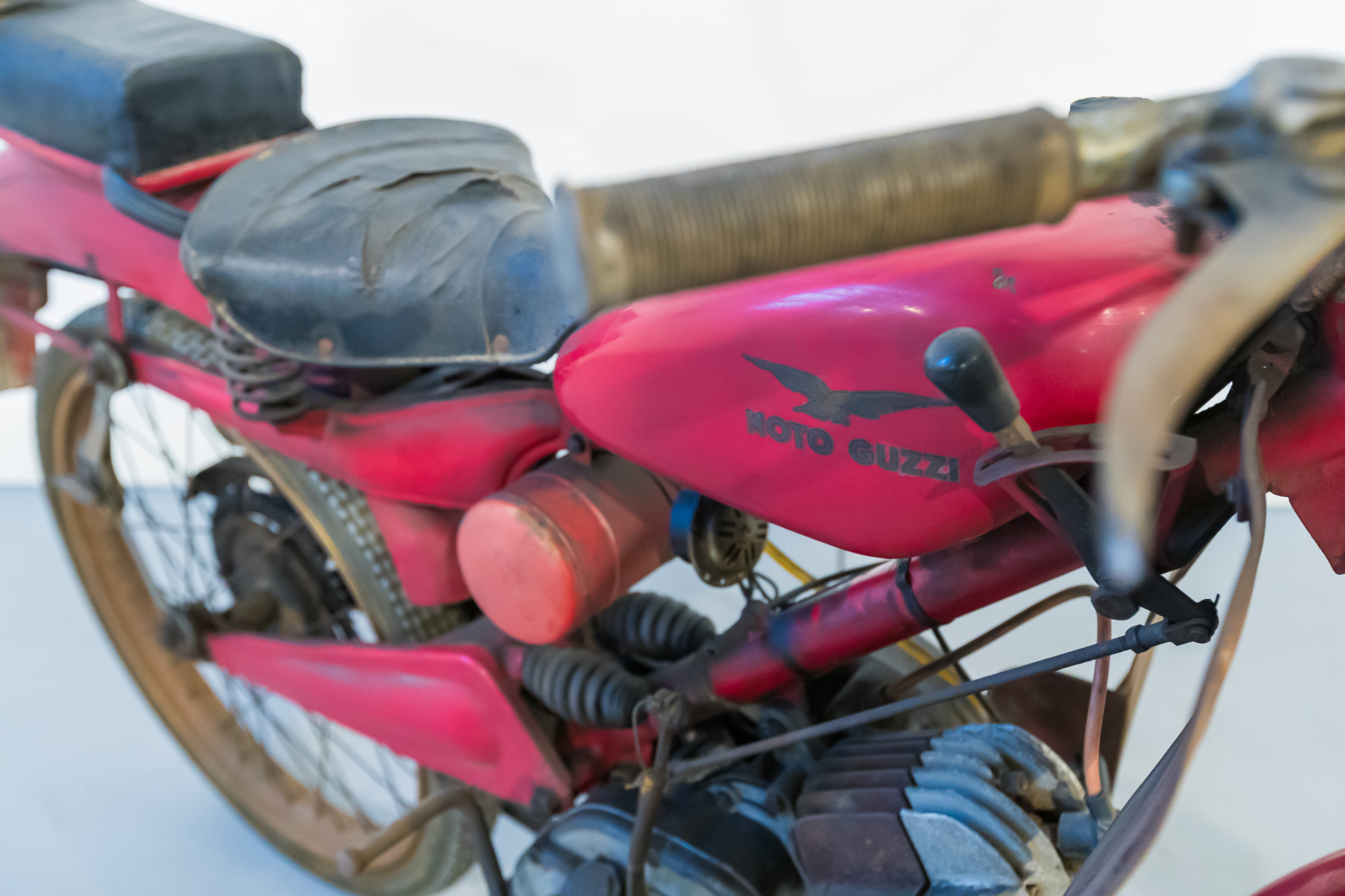 La Moto Guzzi, una delle case motociclistiche più famose di tutti i tempi in oltre un secolo di storia si è cimentata nella progettazione e realizzazione di modelli dalle cilindrate più disparate, dai motorini alle maximoto; uno dei modelli più rappresentativi è la Motoleggera conosciuta come Guzzino prima e successivamente Cardellino, presentata nel 1954, motore monocilindrico a 2 tempi di 65 cc, cambio a tre velocità con leva posizionata a destra del serbatoio, sospensioni con la collaudatissima forcella anteriore telescopica con molla centrale agente in compressione e al posteriore il forcellone oscillante con molle agenti in compressione ed ammortizzatori a compasso regolabili e questa fu l’ultima versione ad avere le sospensioni con queste caratteristiche. Conservato, completo, adatto a progetto di restauro o uso ricambi.