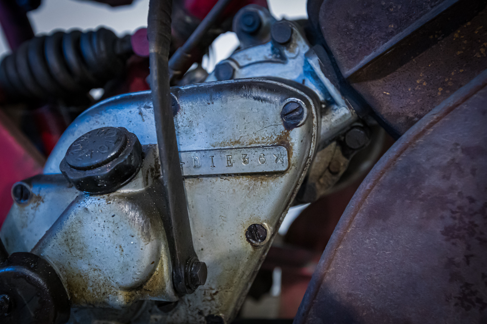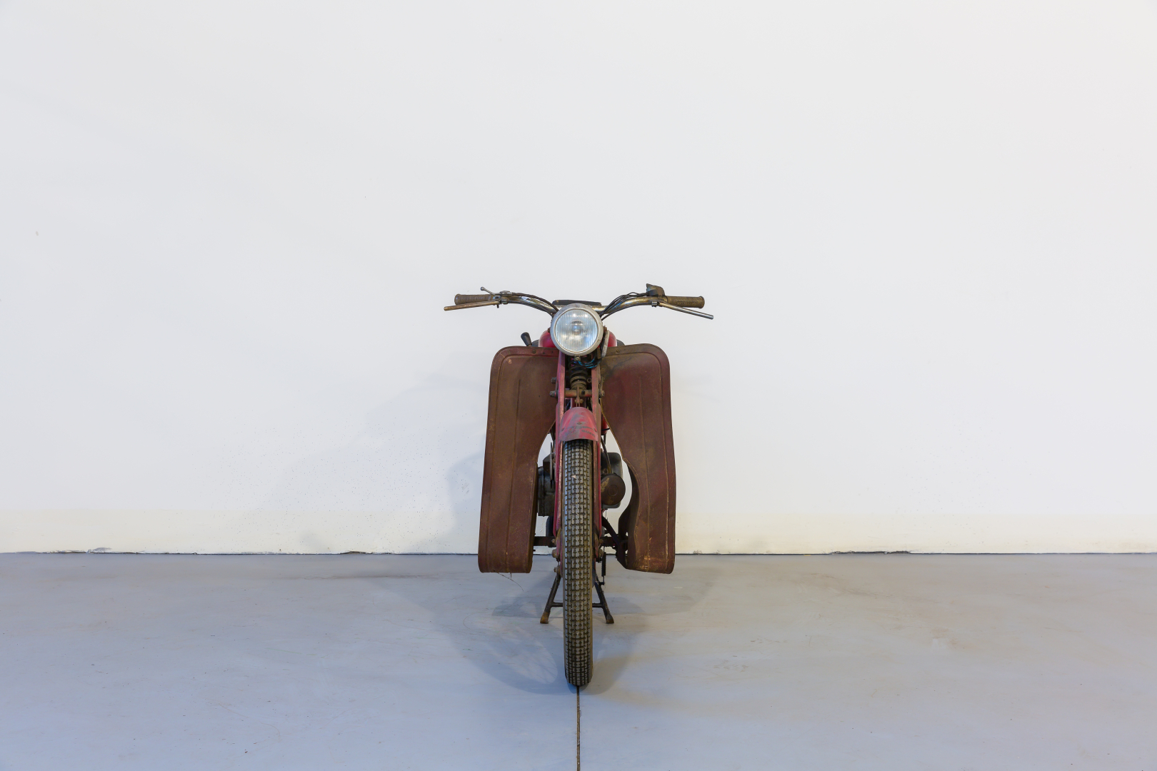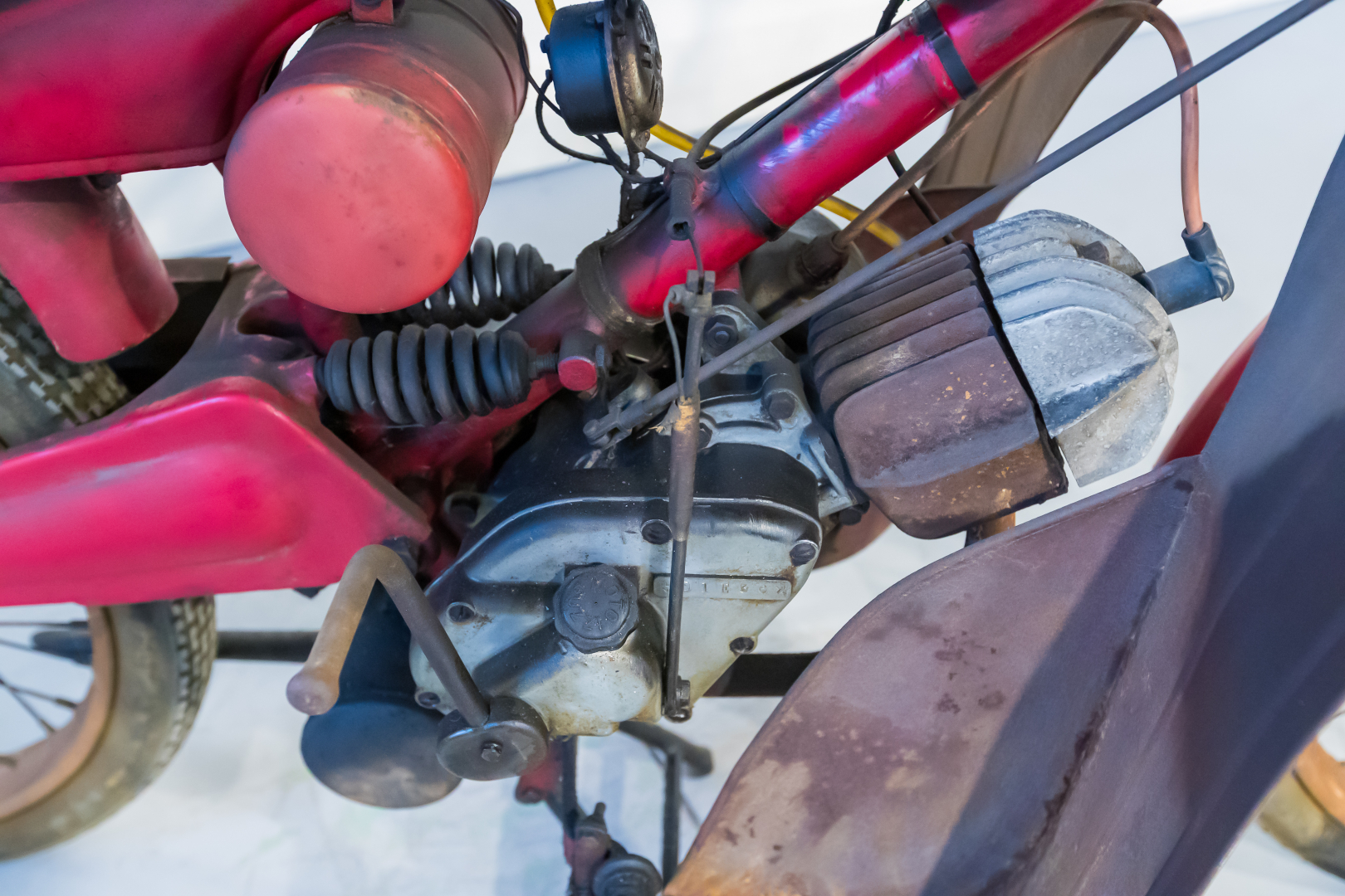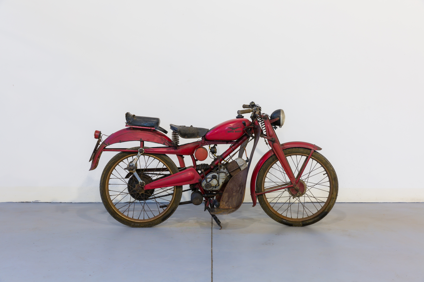 La Moto Guzzi, una delle case motociclistiche più famose di tutti i tempi in oltre un secolo di storia si è cimentata nella progettazione e realizzazione di modelli dalle cilindrate più disparate, dai motorini alle maximoto; uno dei modelli più rappresentativi è la Motoleggera conosciuta come Guzzino prima e successivamente Cardellino, presentata nel 1954, motore monocilindrico a 2 tempi di 65 cc, cambio a tre velocità con leva posizionata a destra del serbatoio, sospensioni con la collaudatissima forcella anteriore telescopica con molla centrale agente in compressione e al posteriore il forcellone oscillante con molle agenti in compressione ed ammortizzatori a compasso regolabili e questa fu l’ultima versione ad avere le sospensioni con queste caratteristiche. Conservato, completo, adatto a progetto di restauro o uso ricambi.