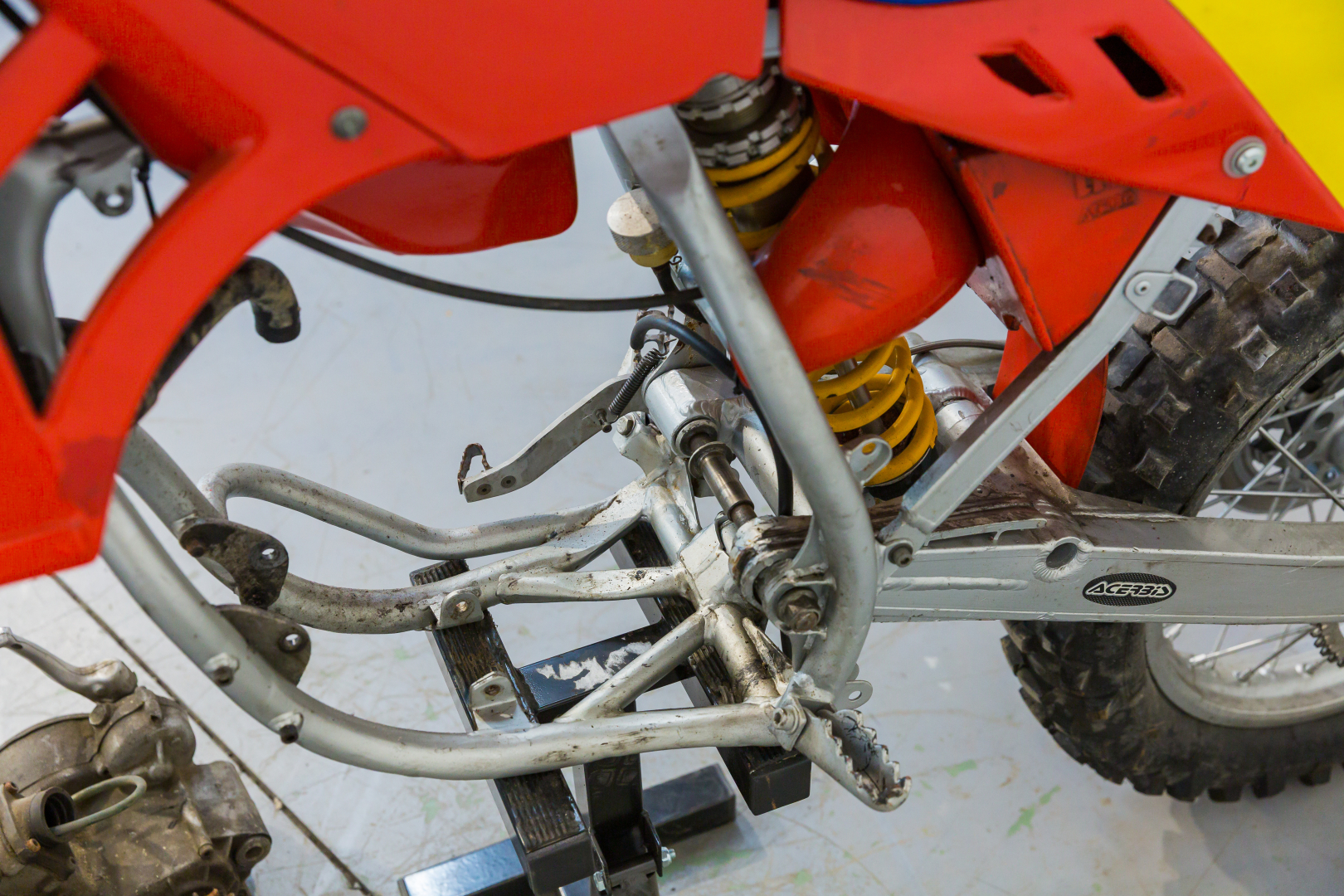 Insieme formato da telaio Rolling Chassis di motocicletta TM 125 Enduro con, separato, motore, privo di carburatore e impianto di scarico. Ideale come ambizioso progetto di restauro o uso ricambi.