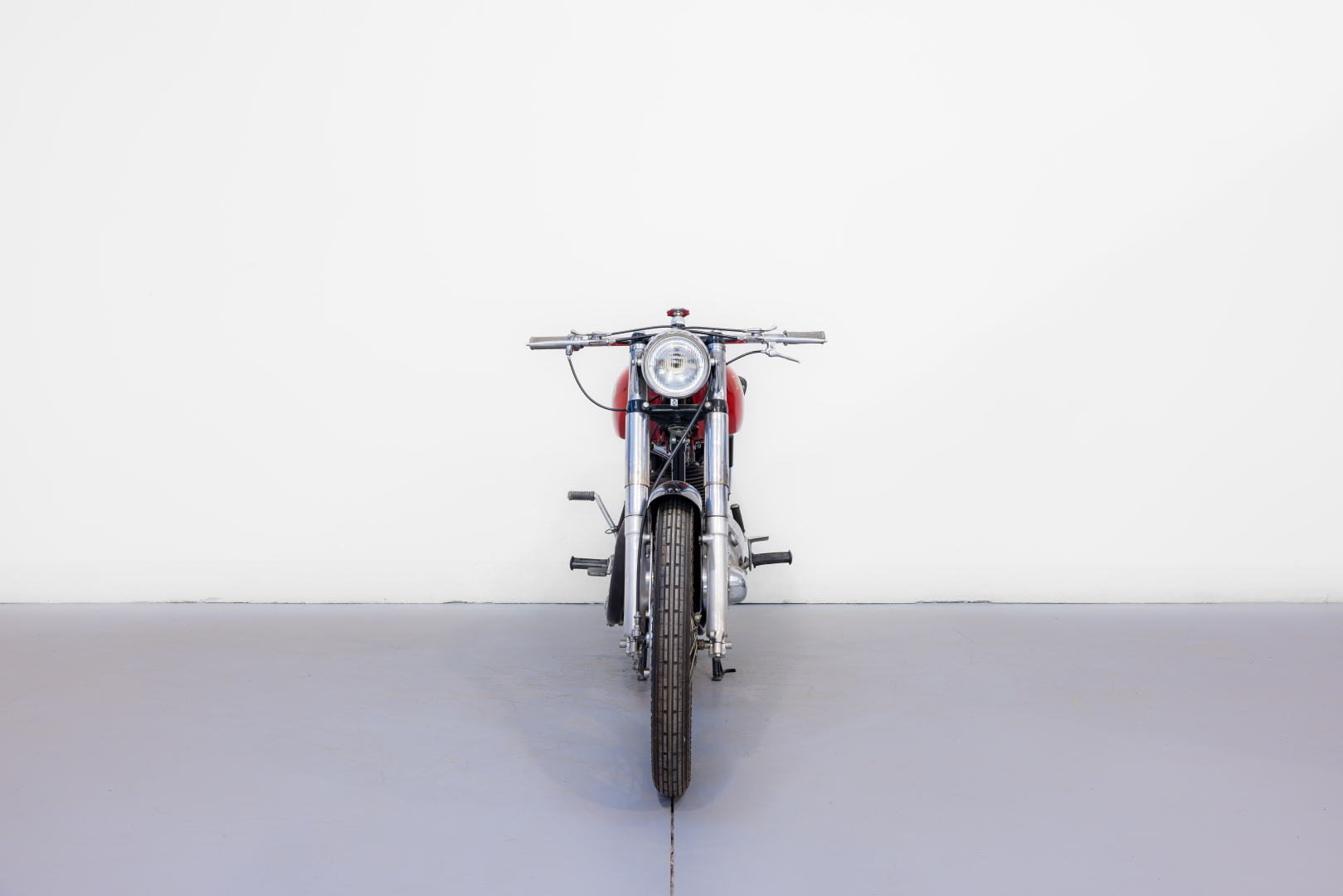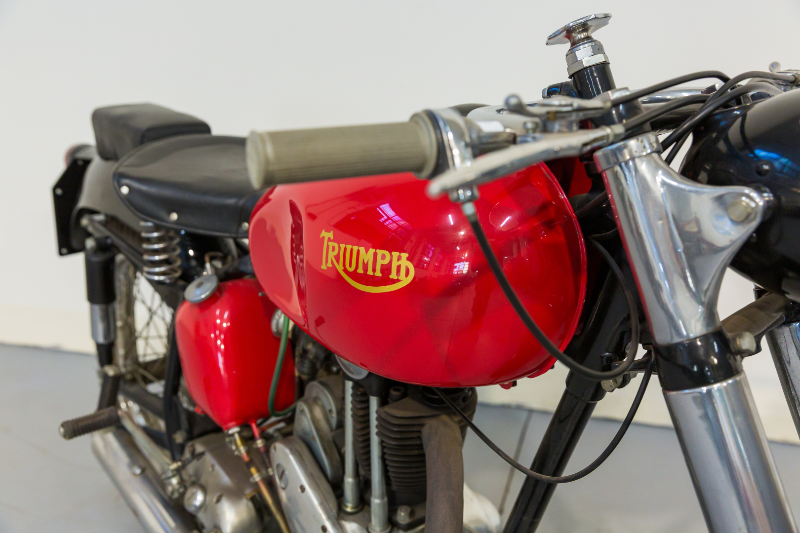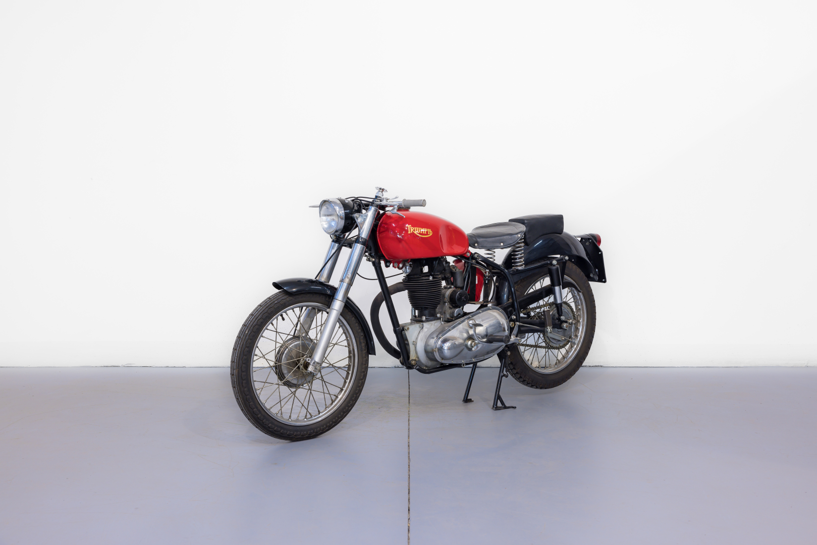 Nel 1937 la Triumph, celebre azienda motociclistica britannica, presenta il modello da 350 denominato 3H caratterizzato dal robusto motore monocilindrico verticale a 4 tempi con la distribuzione a valvole in testa, soluzione decisamente all’avanguardia per quei tempi dove la quasi totalità delle moto circolanti disponeva della distribuzione a valvole laterali, telaio in tubi d’acciaio con sospensione anteriore a forcella e posteriore rigido. Terminato il conflitto bellico la 3H è oggetto di ammodernamenti, soprattutto per la parte ciclistica; viene equipaggiata con una robusta forcella teleidraulica ed il telaio viene modificato per ospitare un forcellone oscillante abbinato con una coppia di ammortizzatori teleidraulici. Il modello proposto è stato restaurato ed è in ottime condizioni. Si consiglia un controllo generale prima dell’utilizzo.