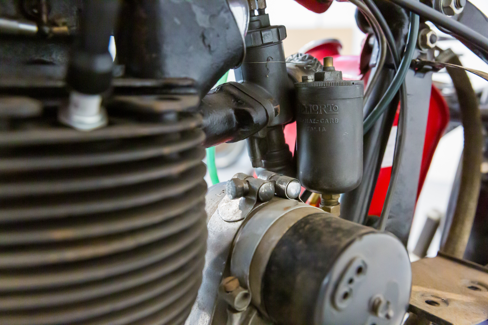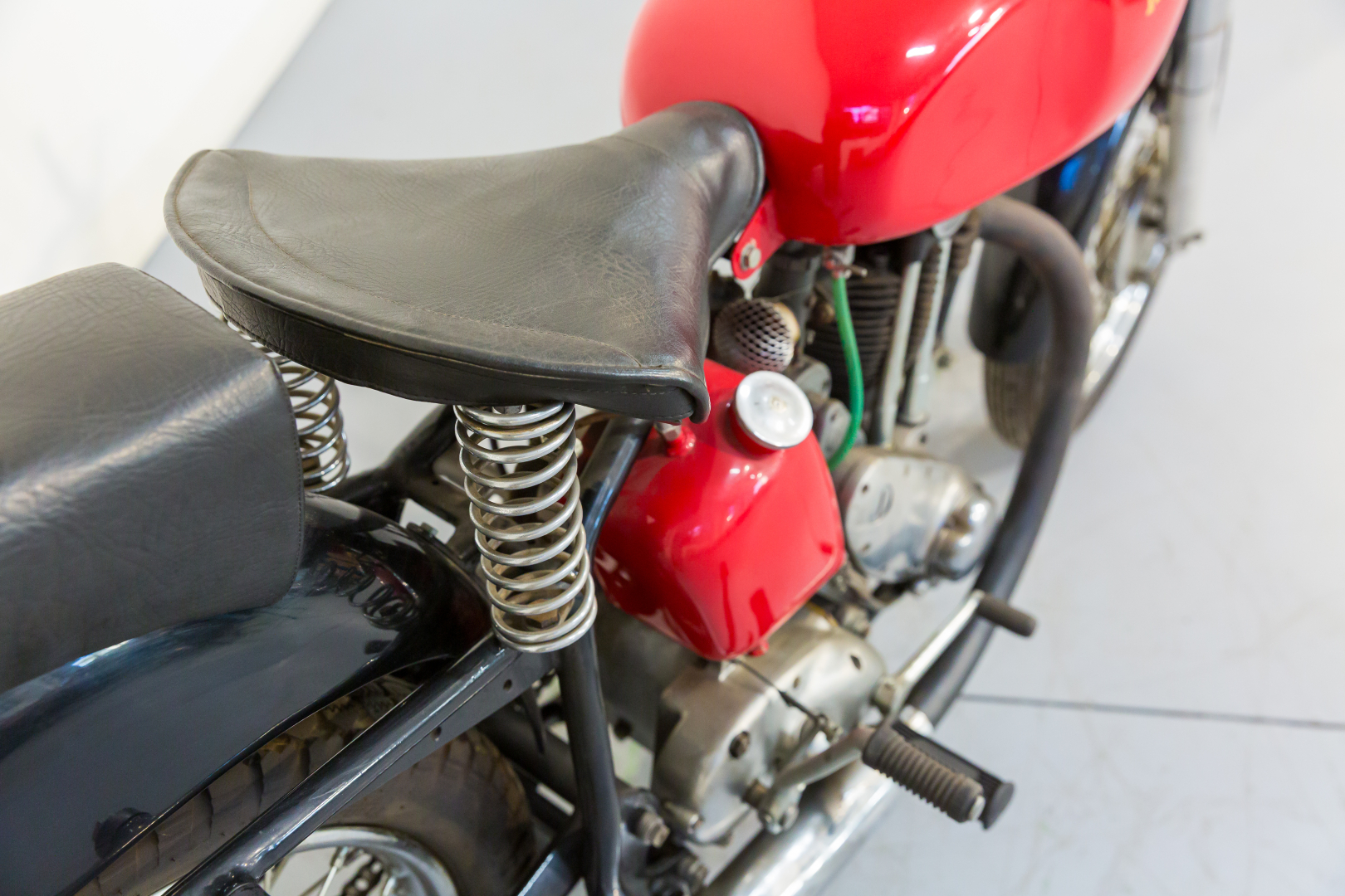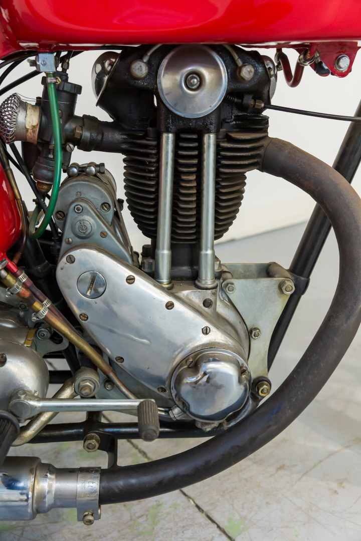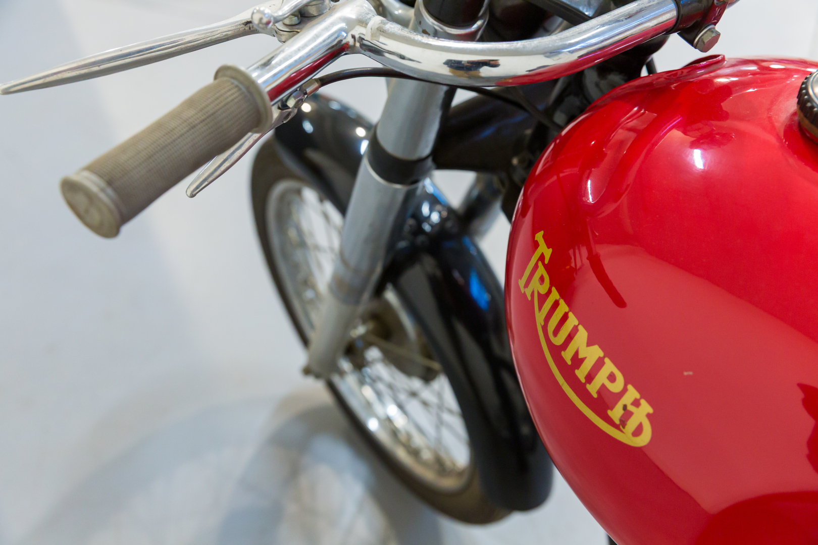 Nel 1937 la Triumph, celebre azienda motociclistica britannica, presenta il modello da 350 denominato 3H caratterizzato dal robusto motore monocilindrico verticale a 4 tempi con la distribuzione a valvole in testa, soluzione decisamente all’avanguardia per quei tempi dove la quasi totalità delle moto circolanti disponeva della distribuzione a valvole laterali, telaio in tubi d’acciaio con sospensione anteriore a forcella e posteriore rigido. Terminato il conflitto bellico la 3H è oggetto di ammodernamenti, soprattutto per la parte ciclistica; viene equipaggiata con una robusta forcella teleidraulica ed il telaio viene modificato per ospitare un forcellone oscillante abbinato con una coppia di ammortizzatori teleidraulici. Il modello proposto è stato restaurato ed è in ottime condizioni. Si consiglia un controllo generale prima dell’utilizzo.