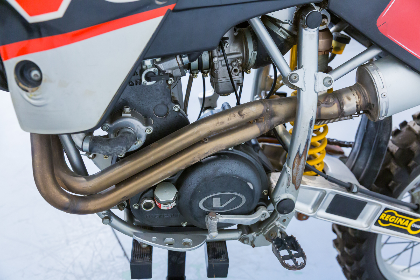 Azienda italiana fondata a Milano dai fratelli Vertemati, la VOR è sempre stata sinonimo di raffinatezza nella componentistica e prestazioni al vertice delle varie categorie. Il 400 cross è dotato di un potentissimo propulsore monocilindrico a 4 tempi, con raffreddamento a liquido, carter laterali in magnesio. Telaio tubolare a doppia culla continua in acciaio, la ciclistica è dotata di una forcella teleidraulica anteriore e al posteriore un raffinato forcellone in alluminio con monoammortizzatore Ohlins e leveraggi per assicurarne l’azione progressiva, completa la dotazione una coppia di generosi e potenti freni a disco a comando idraulico. Completa, in buone condizioni. Si consiglia un controllo generale prima dell’utilizzo.