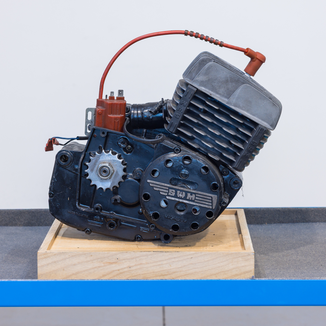 Motore SWM profondamente elaborato, con flangiatura laterale condotto di aspirazione, cilindro ruotato di 180° con scarico posteriore, carburatore e impianto di accensione completo. Si consiglia un controllo generale prima dell’utilizzo.