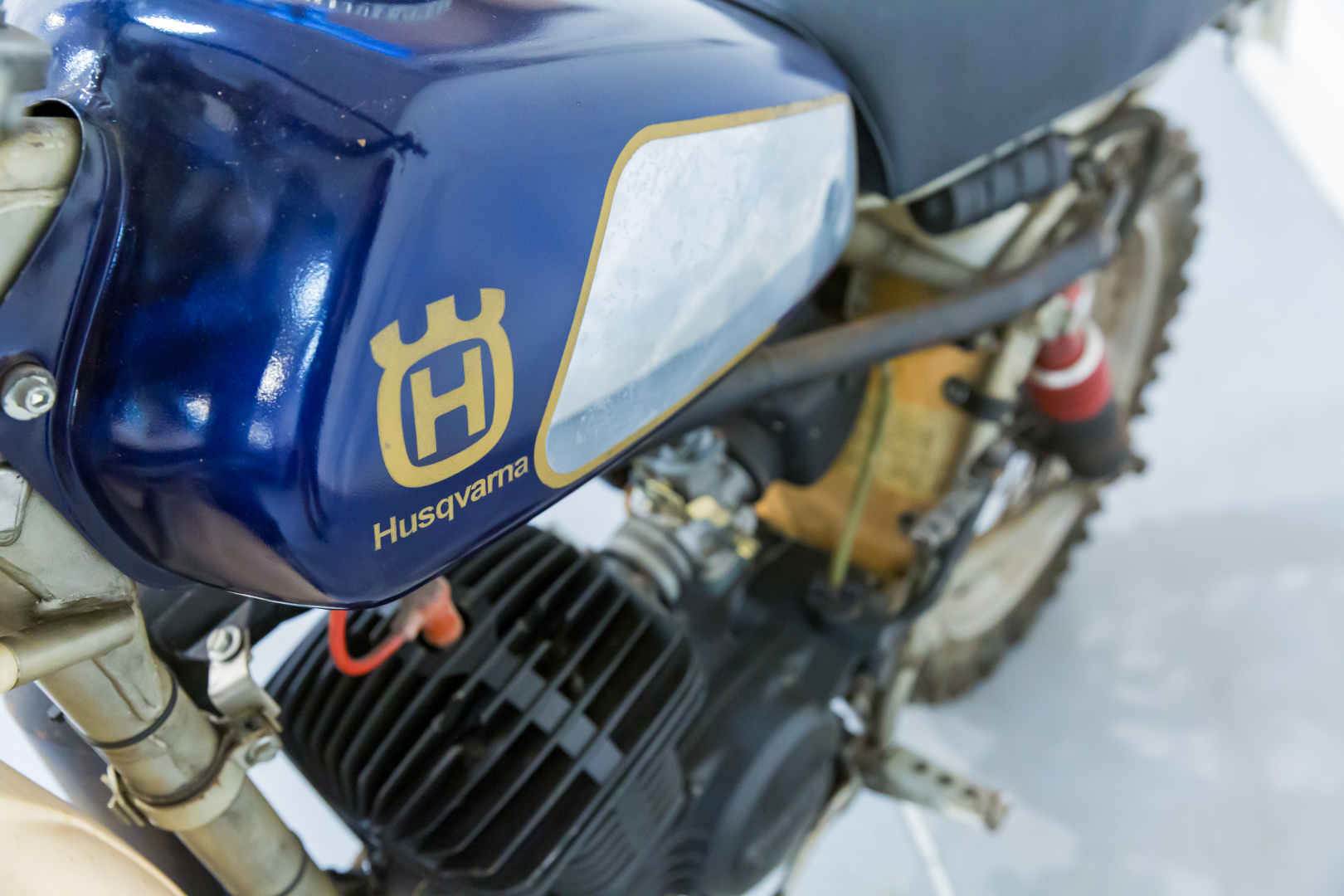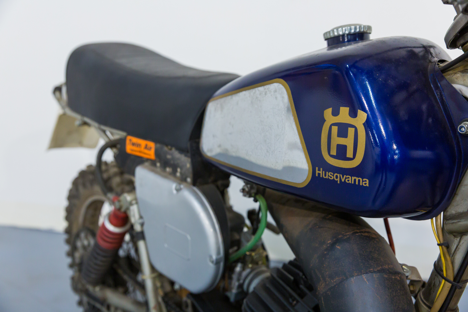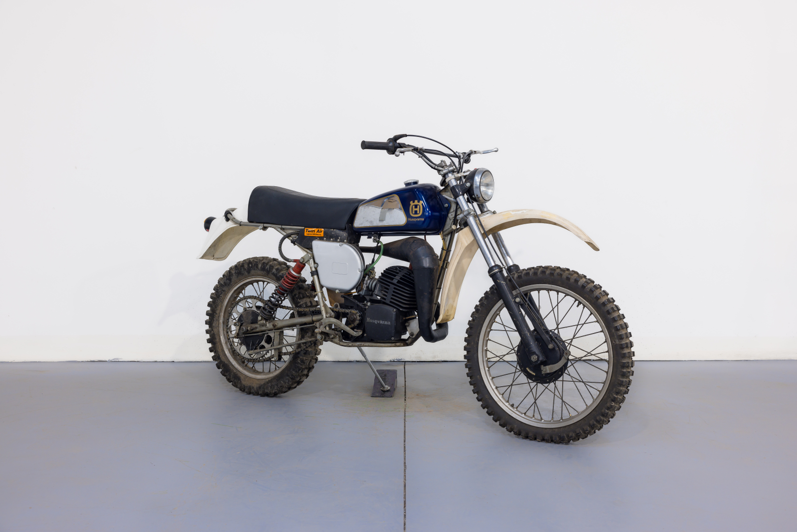 Sul finire degli anni‘70 la Husqvarna rinnova la propria gamma di moto fuoristrada con una serie di nuovi propulsori dotati di ammissione lamellare, grazie alla quale il motore acquista una particolare linearità nell’erogazione della potenza, a tutto vantaggio del piacere di guida. Telaio monotrave sdoppiato in tubi d’acciaio, forcella teleidraulica all’anteriore, forcellone con coppia di ammortizzatori a gas al posteriore, freni a tamburo, ruote con mozzi conici. Conservata, priva di alcuni componenti quali fianchetto sx e silenziatore. Si consiglia un controllo generale prima dell’utilizzo.