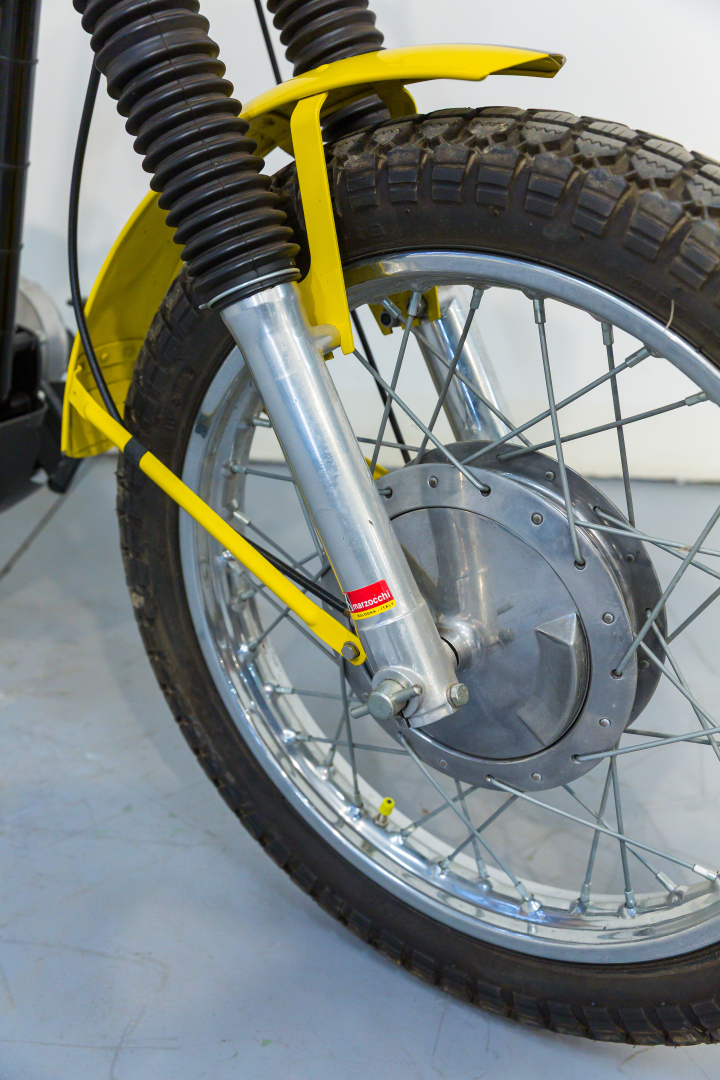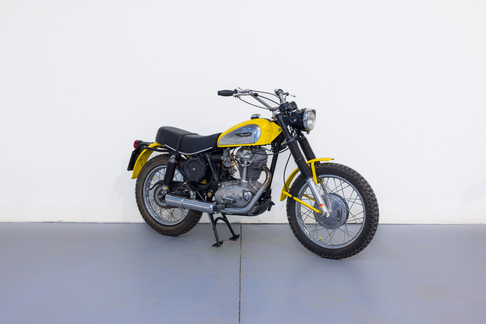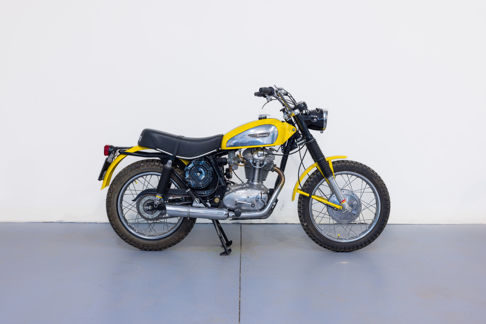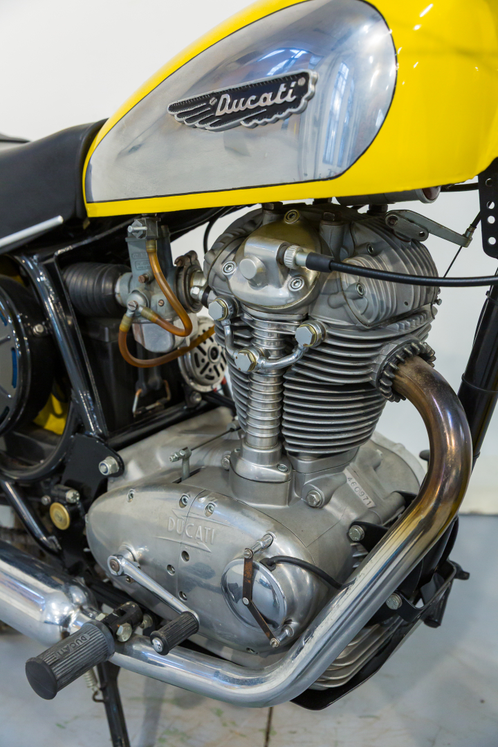 La prima Ducati Scrambler fu presentata nel 1962, dotata di motore monocilindrico a 4 tempi di 250 cc, scarico libero e ruote artigliate, destinata esclusivamente al mercato statunitense. Qualche anno più tardi, precisamente nel 1968 viene presentata la Scrambler per il mercato europeo, scompaiono le ruote artigliate e viene offerta in tre diverse cilindrate, 250, 350 e 450 cc con il classico motore monocilindrico con distribuzione monoalbero a camme in testa comandato da alberello e coppie coniche. Diventa subito un oggetto del desiderio dei giovani centauri, grazie ad un’estetica accattivante, con colori brillanti. Il 450 proposto è in ottime condizioni ed originale. Ha beneficiato di un restauro meticoloso da parte della nota officina Leoncini, specializzata in Ducati. Da sempre in una collezione privata, rappresenta uno dei migliori esemplari sul mercato. Si consiglia un controllo generale prima dell’utilizzo.