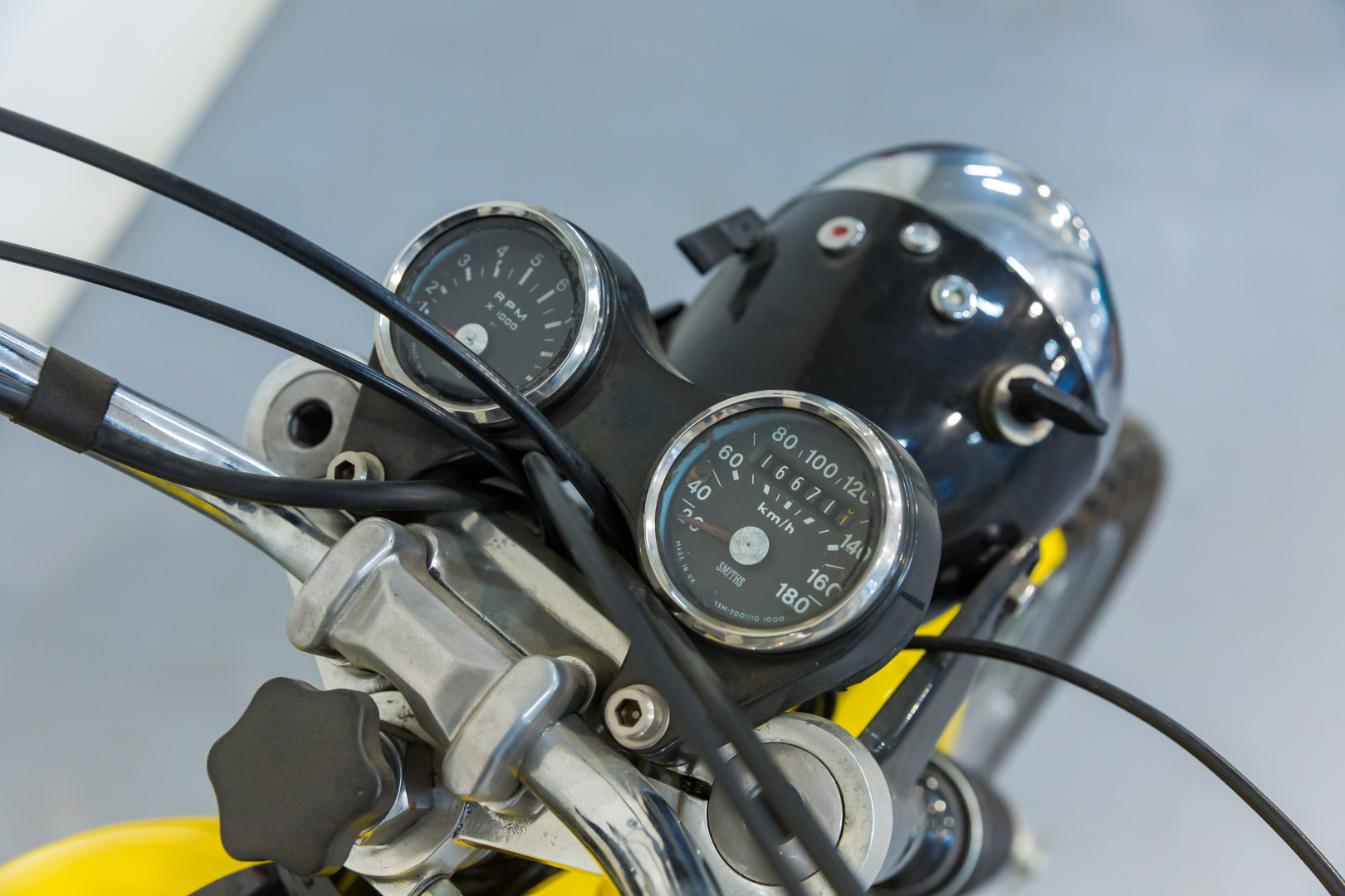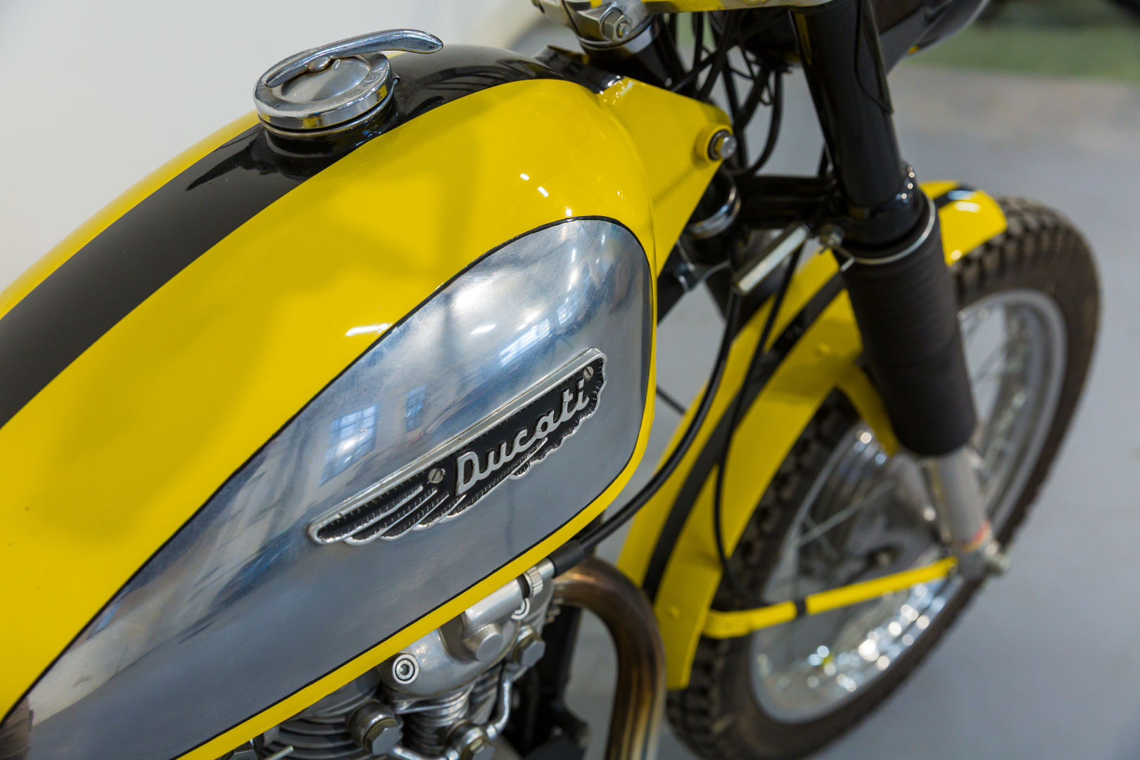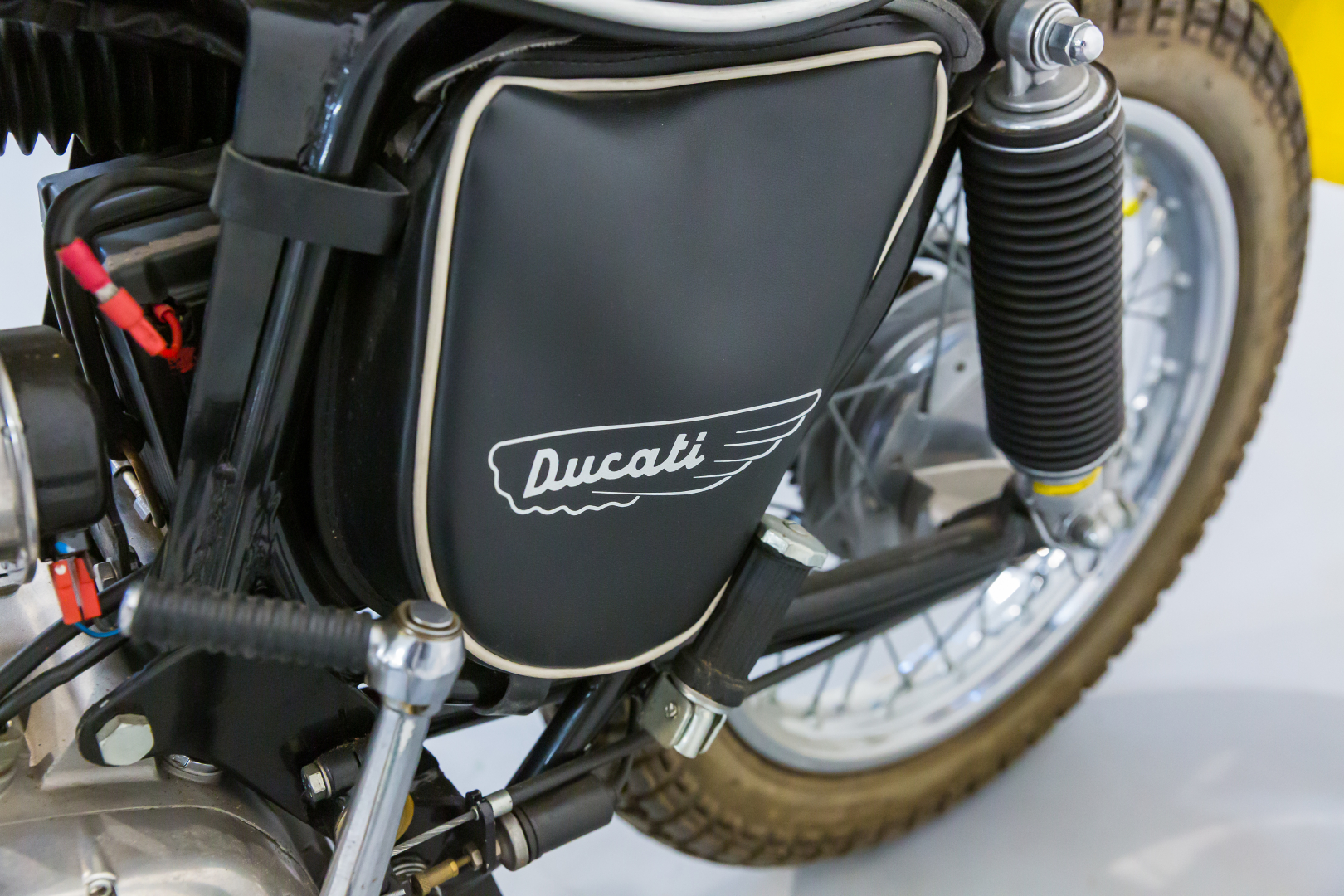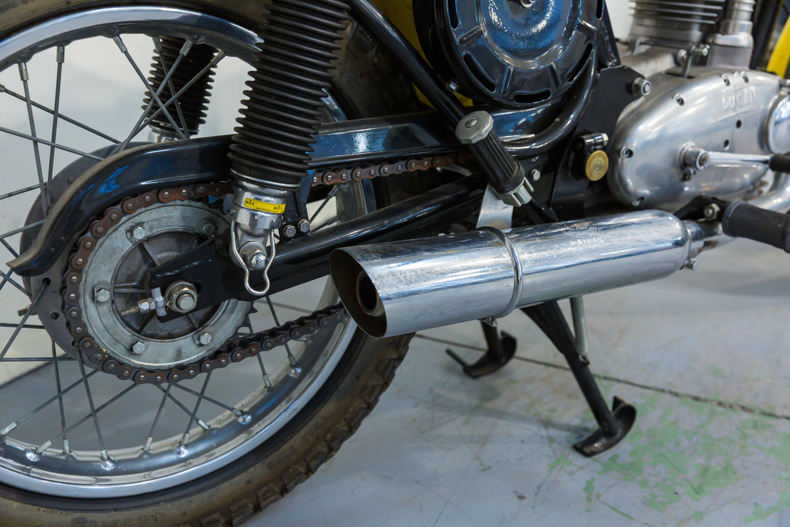 La prima Ducati Scrambler fu presentata nel 1962, dotata di motore monocilindrico a 4 tempi di 250 cc, scarico libero e ruote artigliate, destinata esclusivamente al mercato statunitense. Qualche anno più tardi, precisamente nel 1968 viene presentata la Scrambler per il mercato europeo, scompaiono le ruote artigliate e viene offerta in tre diverse cilindrate, 250, 350 e 450 cc con il classico motore monocilindrico con distribuzione monoalbero a camme in testa comandato da alberello e coppie coniche. Diventa subito un oggetto del desiderio dei giovani centauri, grazie ad un’estetica accattivante, con colori brillanti. Il 450 proposto è in ottime condizioni ed originale. Ha beneficiato di un restauro meticoloso da parte della nota officina Leoncini, specializzata in Ducati. Da sempre in una collezione privata, rappresenta uno dei migliori esemplari sul mercato. Si consiglia un controllo generale prima dell’utilizzo.