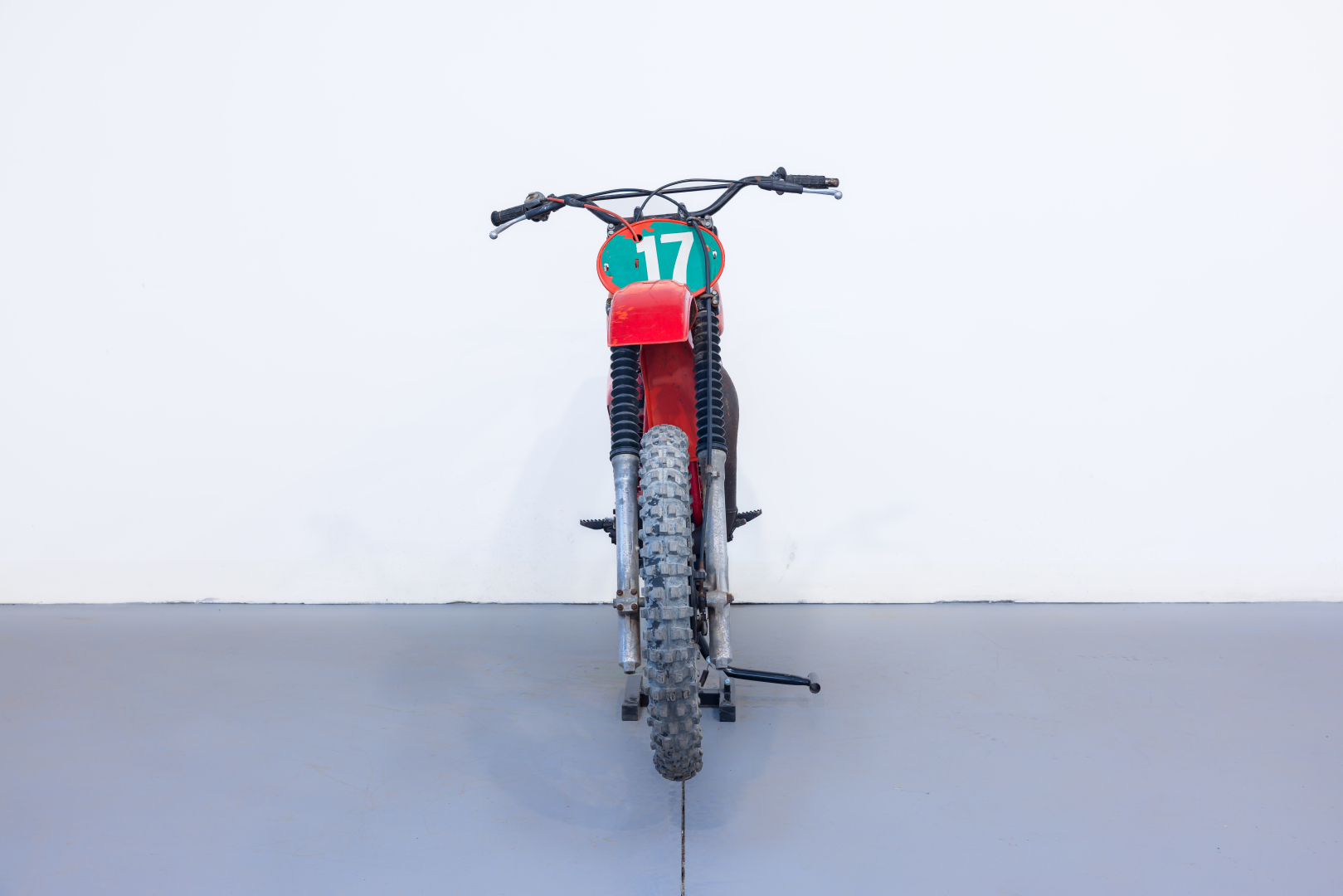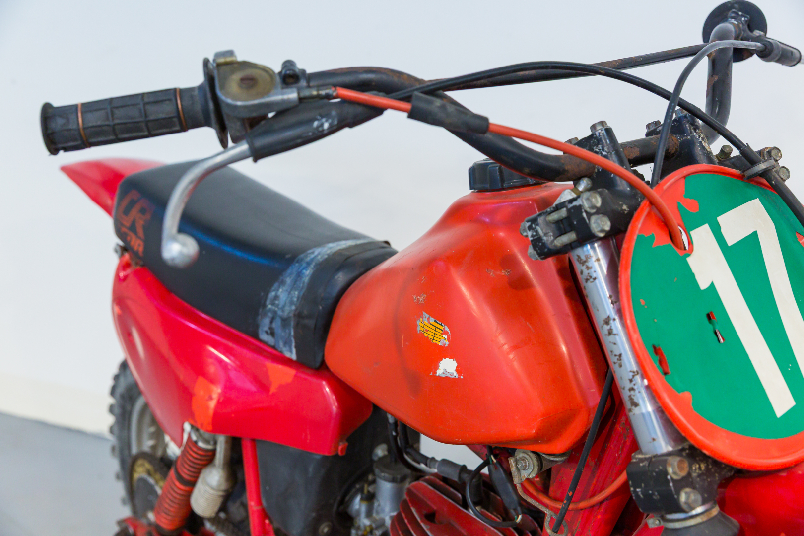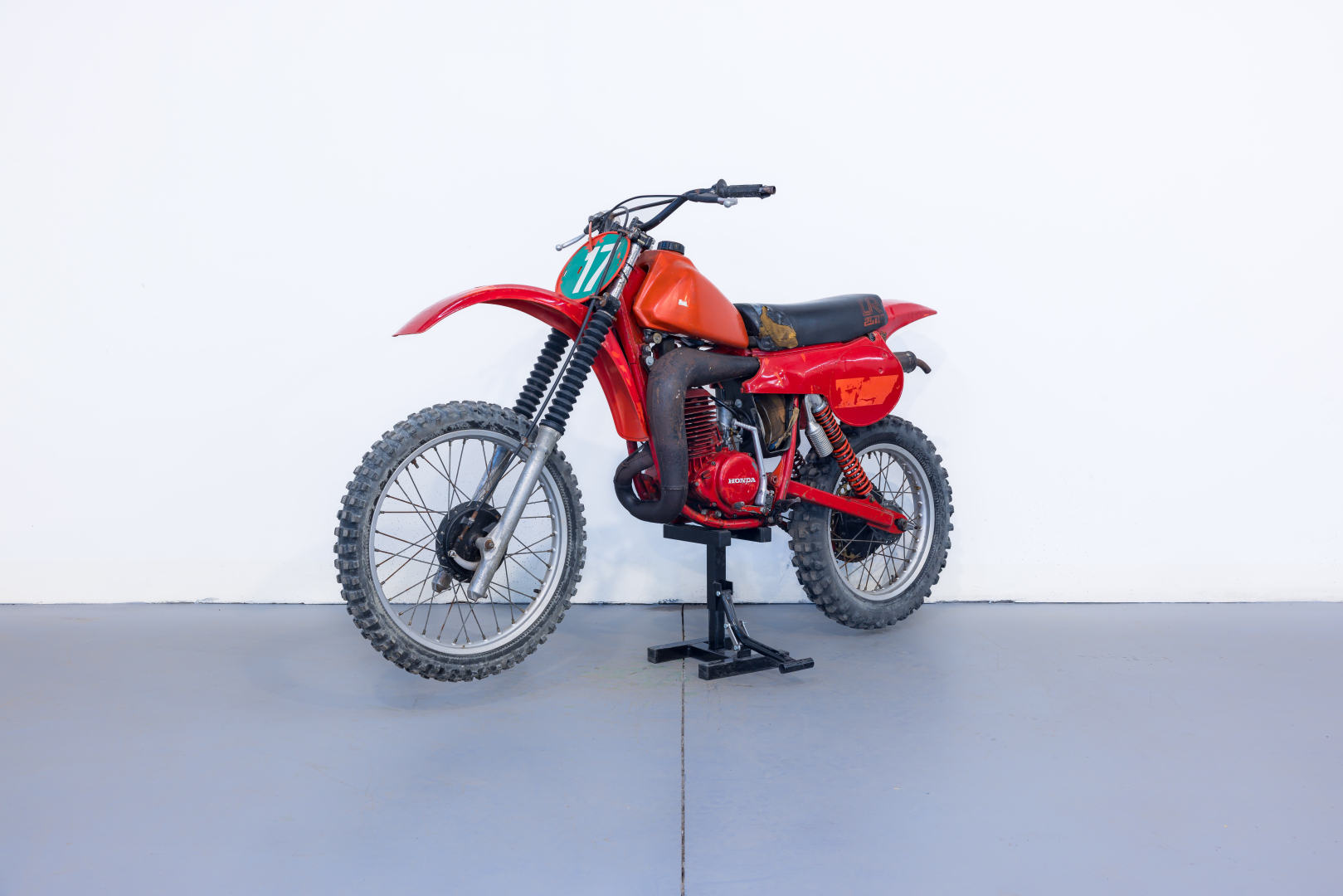 Nel 1980 Honda presenta il suo modello cross denominato CR 250R, equipaggiato da un rinnovato telaio tubolare a doppia culla in acciaio destinato ad essere poi impiegato per lungo tempo sulle moto da competizione fuoristrada, dotata di un potente motore monocilindrico a 2 tempi con ammissione lamellare, molto leggera grazie al largo utilizzo di leghe leggere e materiale plastico per le sovrastrutture e il serbatoio. E’ particolarmente ricercato dai collezionisti in quanto fu l’ultimo modello raffreddato ad aria con forcellone oscillante e coppia di ammortizzatori a gas. Completa, conservata, adatta ad ambizioso progetto di restauro o uso ricambi.