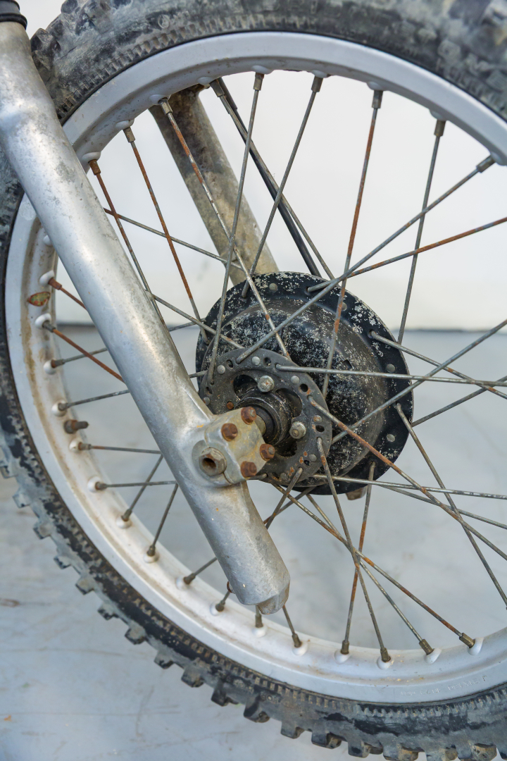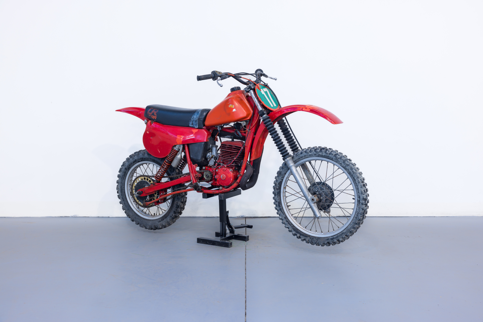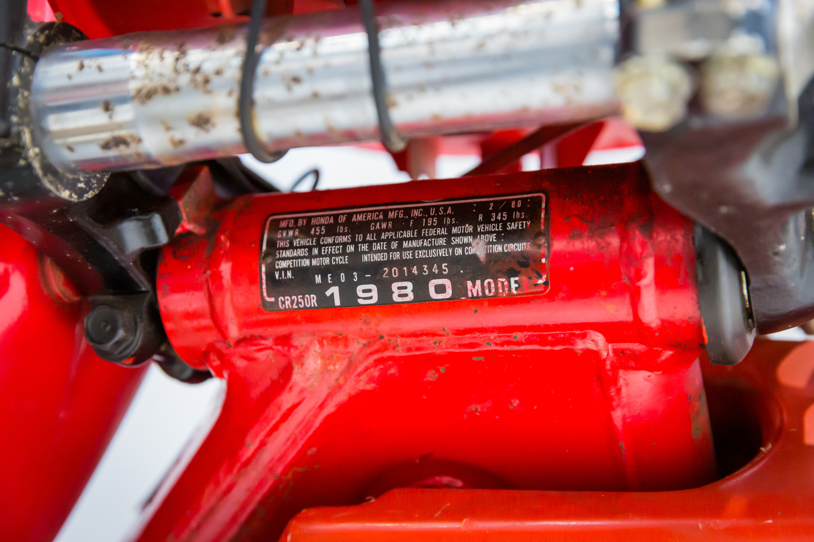 Nel 1980 Honda presenta il suo modello cross denominato CR 250R, equipaggiato da un rinnovato telaio tubolare a doppia culla in acciaio destinato ad essere poi impiegato per lungo tempo sulle moto da competizione fuoristrada, dotata di un potente motore monocilindrico a 2 tempi con ammissione lamellare, molto leggera grazie al largo utilizzo di leghe leggere e materiale plastico per le sovrastrutture e il serbatoio. E’ particolarmente ricercato dai collezionisti in quanto fu l’ultimo modello raffreddato ad aria con forcellone oscillante e coppia di ammortizzatori a gas. Completa, conservata, adatta ad ambizioso progetto di restauro o uso ricambi.
