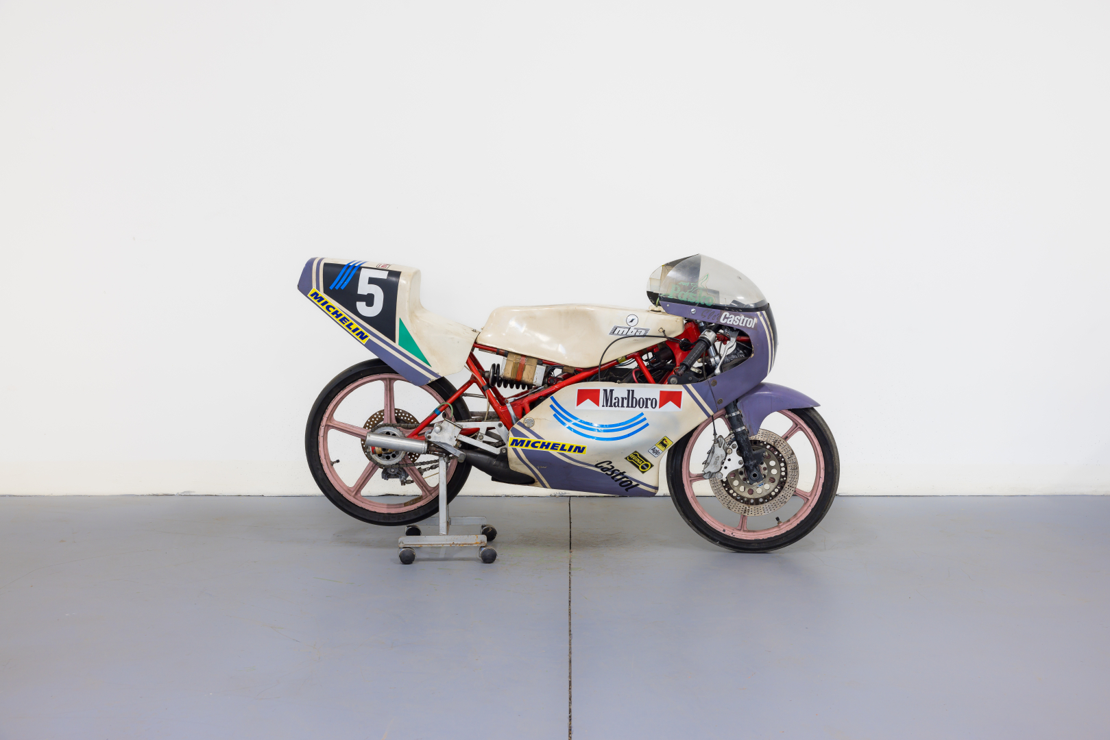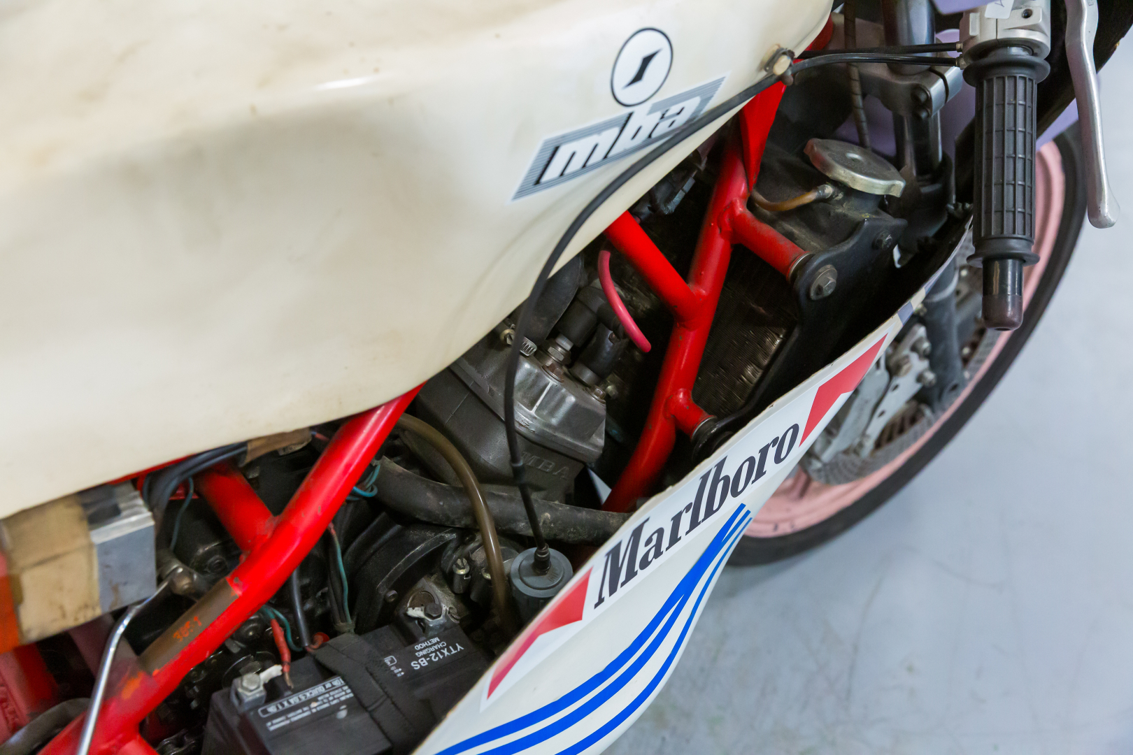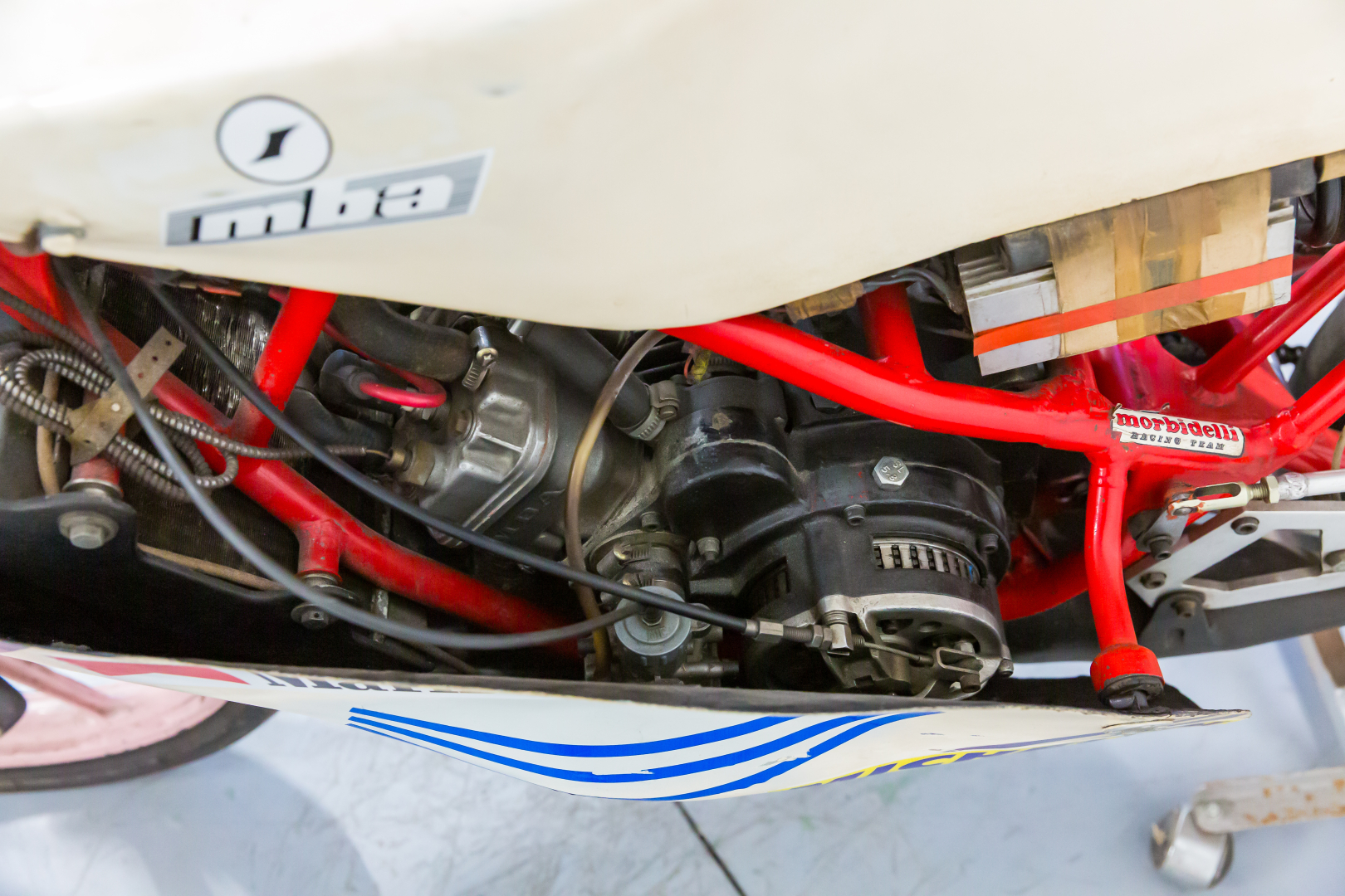 Alla fine del 1979 Giancarlo Morbidelli, un abile industriale pesarese specializzato nella costruzione di macchine per la lavorazione del legno con la grande passione per le moto da corsa, che aveva già da qualche anno avviato un proprio marchio, con il proprio cognome, costruendo motoleggere da 50 e 125cc vittoriose in molte competizioni di Velocità, unisce le proprie competenze con quelle dalla Benelli Armi dando vita alla MBA (Morbidelli Benelli Armi). Questo sodalizio darà al marchio ben 8 titoli iridati, 14 titoli nazionali e 7 successi continentali. Il modello più rappresentativo e vittorioso era equipaggiato da un motore bicilindrico a 2 tempi con ammissione a disco rotante e cambio a 6 velocità inserito in un telaio a traliccio in acciaio abbinati a componentistica della miglior qualità disponibile per l’epoca. Il modello proposto è un VR 125 Cantilever del 1985 con il monoammortizzatore posteriore, è appartenuto al Pilota Anton Slegl che l’ha condotto con successo in competizioni del Campionato Nazionale Ceco; è stato aggiornato con componentistica non originale quali i cerchioni ed i freni, che ora sono un monodisco anteriore autoventilato di origine Yamaha come il resto dell’impianto. Conservata, completa, in discrete condizioni. Si consiglia un controllo generale prima dell’utilizzo.