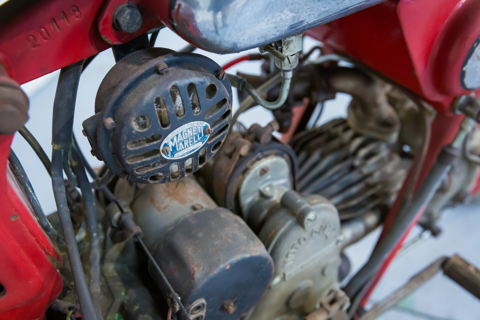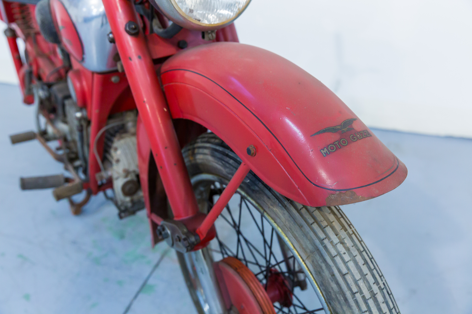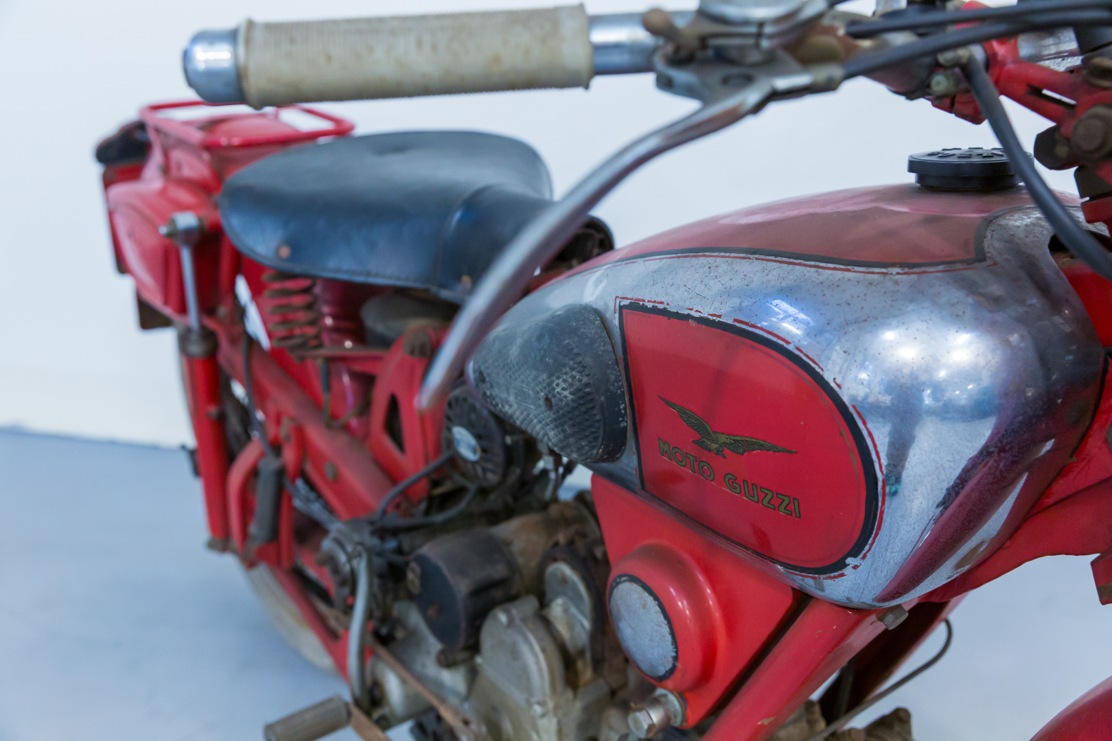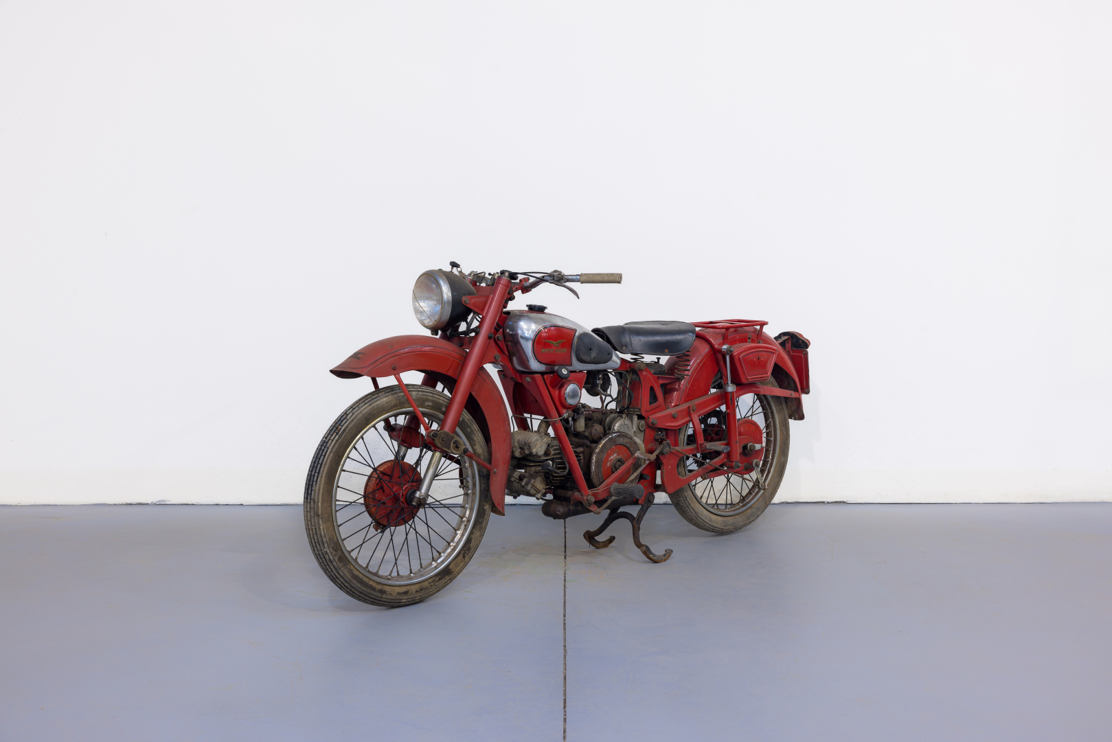 La Moto Guzzi riprese nel 1948 il modello denominato Airone, presentato nel 1939, ed ammodernandolo per renderlo più attraente. Il famoso monocilindrico orizzontale vide l’adozione della testata in lega leggera, al reparto sospensioni venne adottata anteriormente una forcella telescopica rovesciata, con un originale piastra di ancoraggio e un generoso freno a tamburo; al posteriore forcellone oscillante con molle a spirale poste sotto il motore ed una coppia di ammortizzatori supplementari fissati al telaio. Conservata, in discrete condizioni, priva di alcuni componenti, adatta a progetto di restauro o uso ricambi.