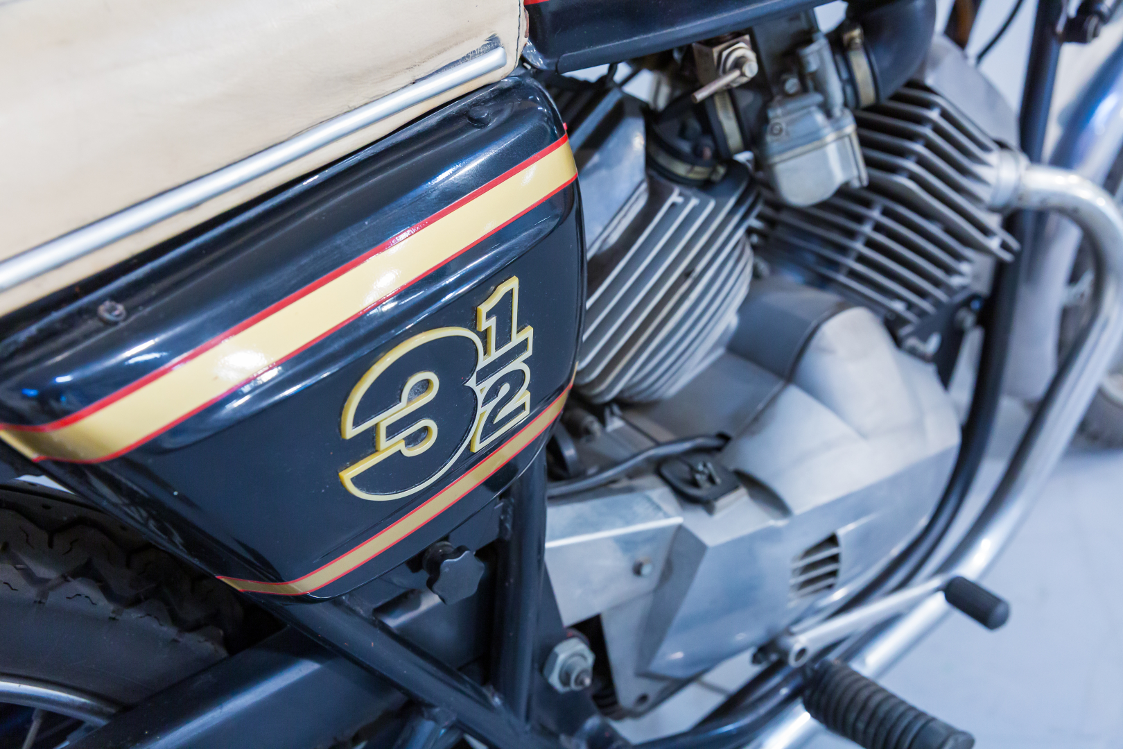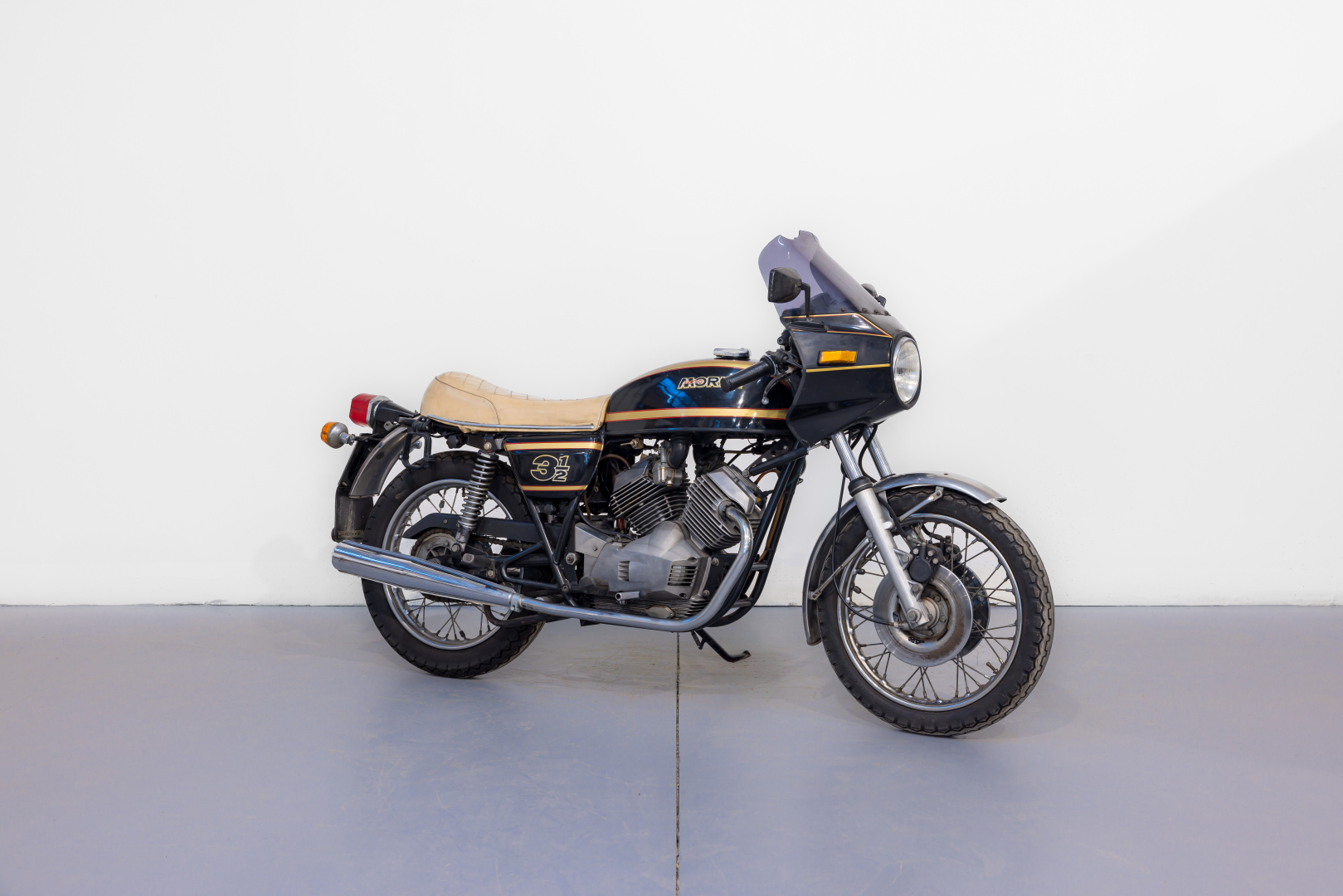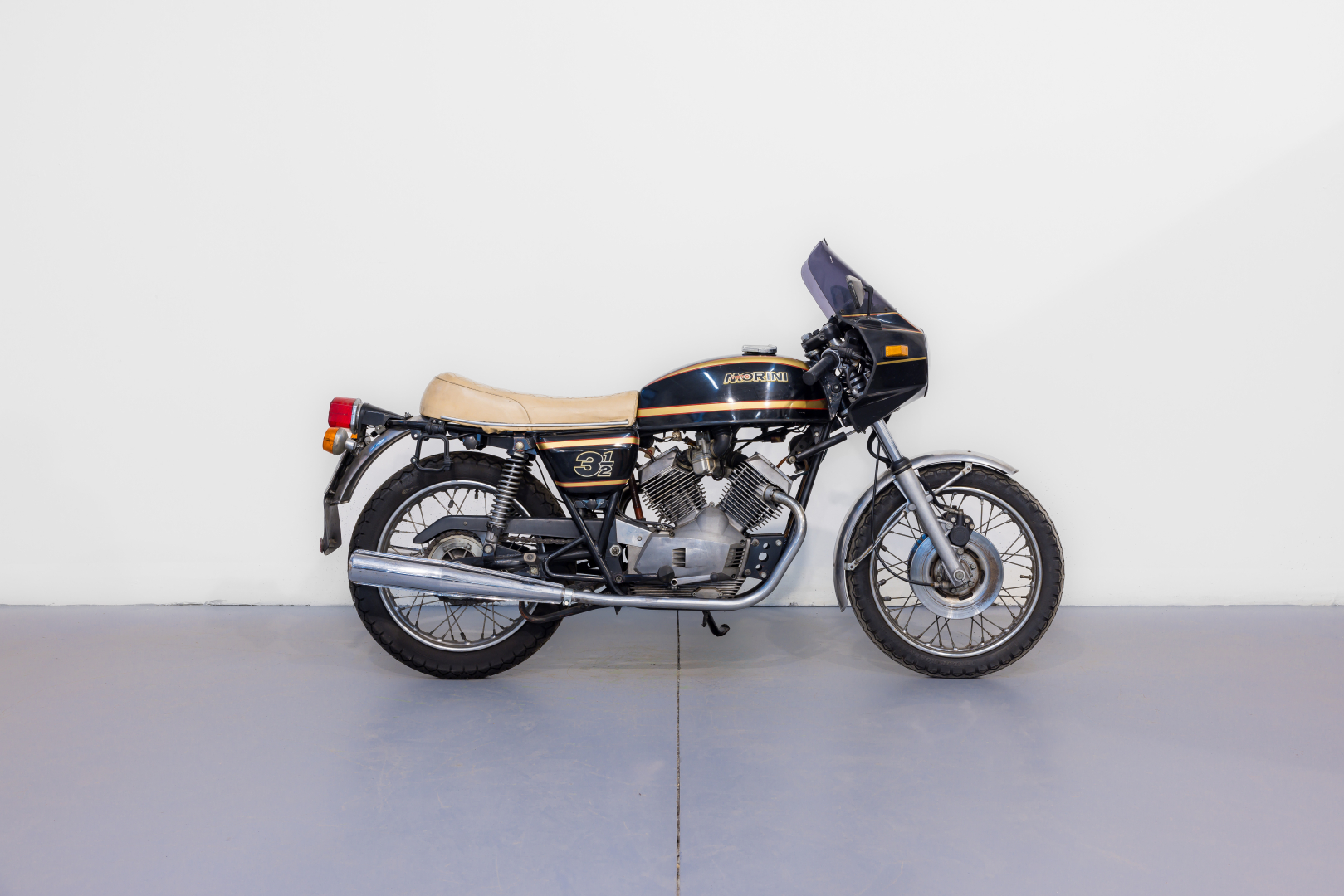 Nel 1973 la Moto Morini, interpretando quelle che sono le richieste del mercato motociclistico dell’epoca, presenta il modello denominato 3 ½, una robusta motocicletta con telaio a doppia culla chiusa in tubi d’acciaio, forcella anteriore telescopica e, al posteriore forcellone oscillante con una coppia di ammortizzatori teleidraulici. Il motore è un innovativo bicilindrico longitudinale a 4 tempi a V di 72° con distribuzione ad aste e bilancieri e teste piatte tipo Heron, progettato dell’Ing. Franco Lambertini. Questo modello, caratterizzato da prestazioni brillanti e grande affidabilità, nel pieno stile Morini, riscuote un ottimo successo e nelle versioni successive viene dotato del freno anteriore a disco comandato idraulicamente. Il modello proposto è caratterizzato da alcuni componenti aftermarket quali la sella ed i semimanubri. Completo, in discrete condizioni. Si consiglia un controllo generale prima dell’utilizzo.