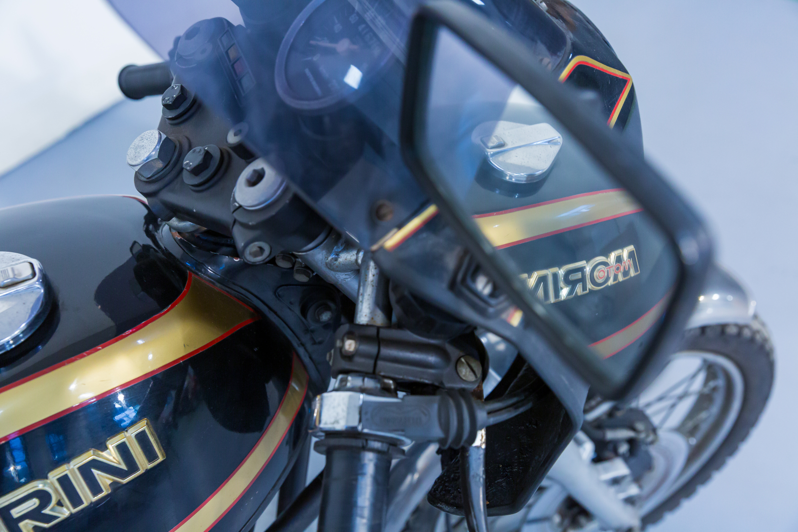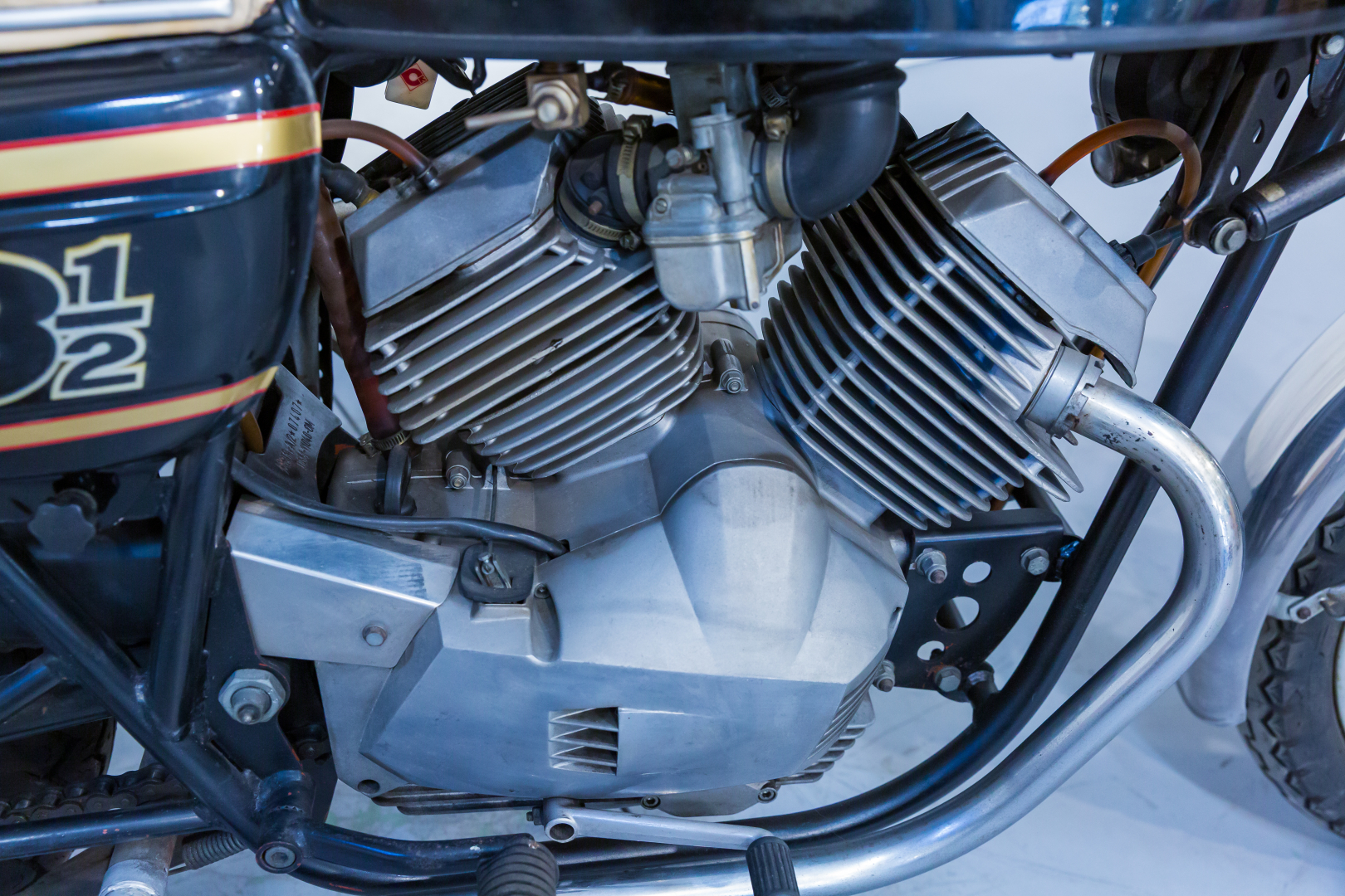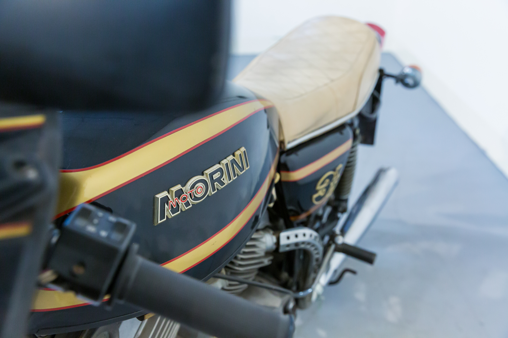Nel 1973 la Moto Morini, interpretando quelle che sono le richieste del mercato motociclistico dell’epoca, presenta il modello denominato 3 ½, una robusta motocicletta con telaio a doppia culla chiusa in tubi d’acciaio, forcella anteriore telescopica e, al posteriore forcellone oscillante con una coppia di ammortizzatori teleidraulici. Il motore è un innovativo bicilindrico longitudinale a 4 tempi a V di 72° con distribuzione ad aste e bilancieri e teste piatte tipo Heron, progettato dell’Ing. Franco Lambertini. Questo modello, caratterizzato da prestazioni brillanti e grande affidabilità, nel pieno stile Morini, riscuote un ottimo successo e nelle versioni successive viene dotato del freno anteriore a disco comandato idraulicamente. Il modello proposto è caratterizzato da alcuni componenti aftermarket quali la sella ed i semimanubri. Completo, in discrete condizioni. Si consiglia un controllo generale prima dell’utilizzo.