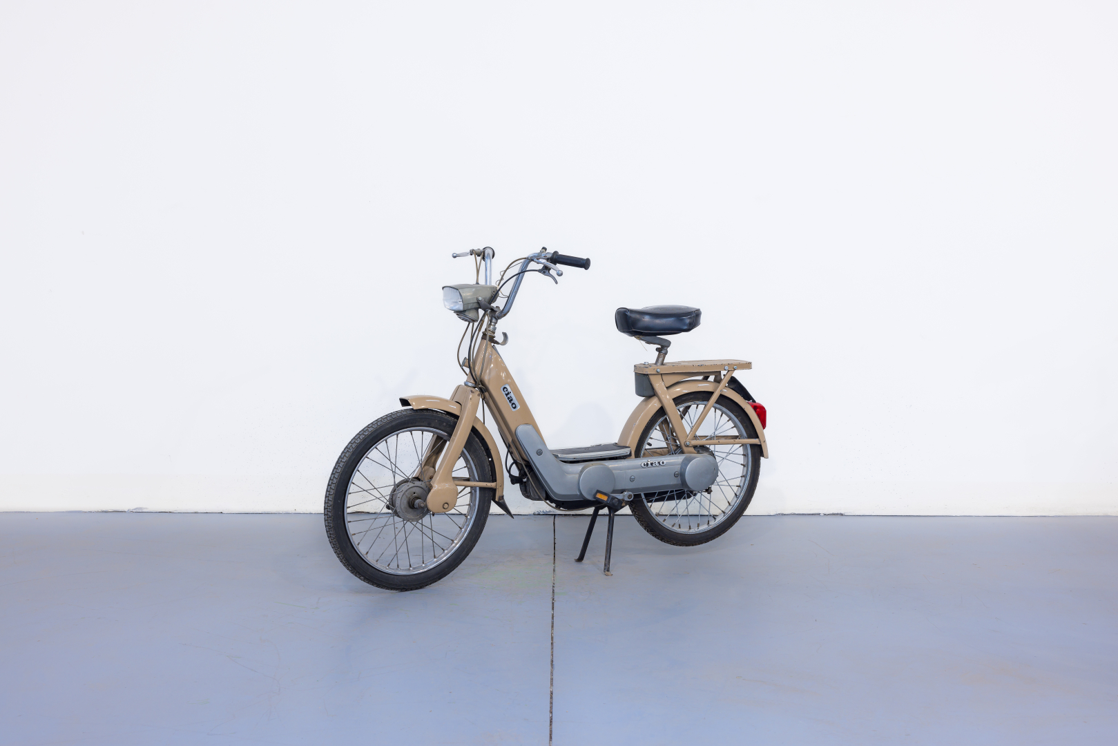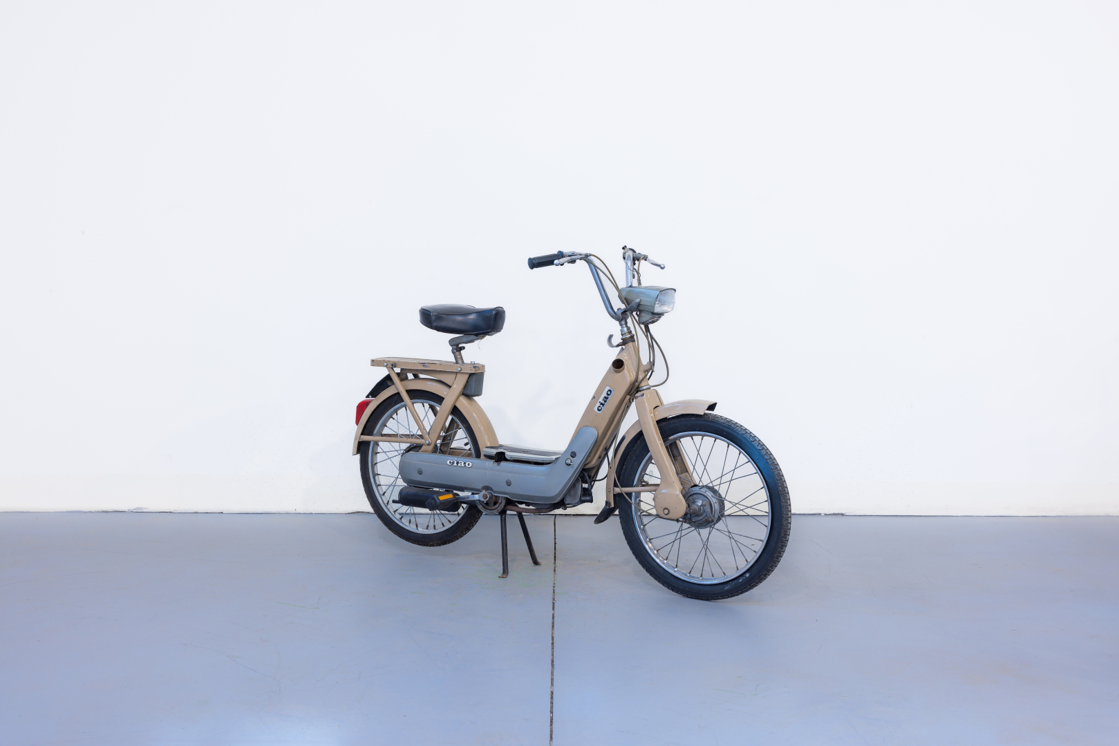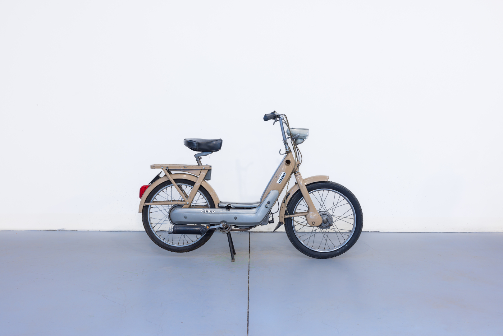 Il Ciao, iconico ciclomotore prodotto dalla Piaggio sin dal 1967, uno dei ciclomotori più venduti di tutti i tempi. Caratterizzato da una semplicità meccanica senza eguali, spinto da un piccolo motore monocilindrico orizzontale a 2 tempi da 49cc e dotato di un telaio in lamiera d’acciaio, le cui forme richiamano le biciclette da donna del tempo e al cui interno è ricavato il serbatoio del carburante. Il modello proposto è un R2, conservato, discrete condizioni, privo di alcuni componenti. Si consiglia un controllo generale prima dell’utilizzo.