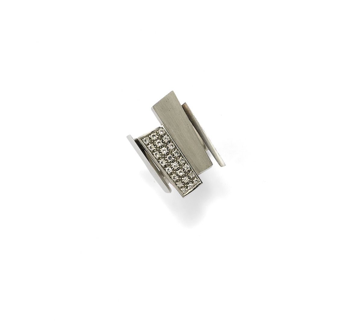 realizzato in oro bianco satinato di forma asimmetrica con pavé in diamanti taglio huit-huit di ct 0,25 ca. Circa 1970.