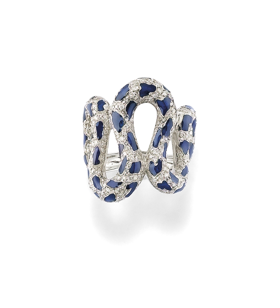 in oro bianco con motivo a spire incastonate con diamanti taglio brillante di ct 1,28 inframmezzate da macchie in smalto blu traslucido.