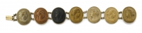 formato da una spilla in oro giallo e bottoni in corallo, una antica demi-parure di spilla e anello in oro giallo, perline e occhio di tigre e un bracciale in metallo con cammei di lava raffiguranti profili femminili.