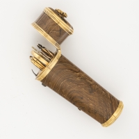 realizzato con astuccio cilindrico in agata marrone leggermente a scalare ornato da cornice e anello di sospensione in oro giallo. Apertura in diamante. L'interno presenta tavolette in avorio, pinzette, forbici, punteruolo, un ago e un rasoio con manico in diaspro sanguigno.
