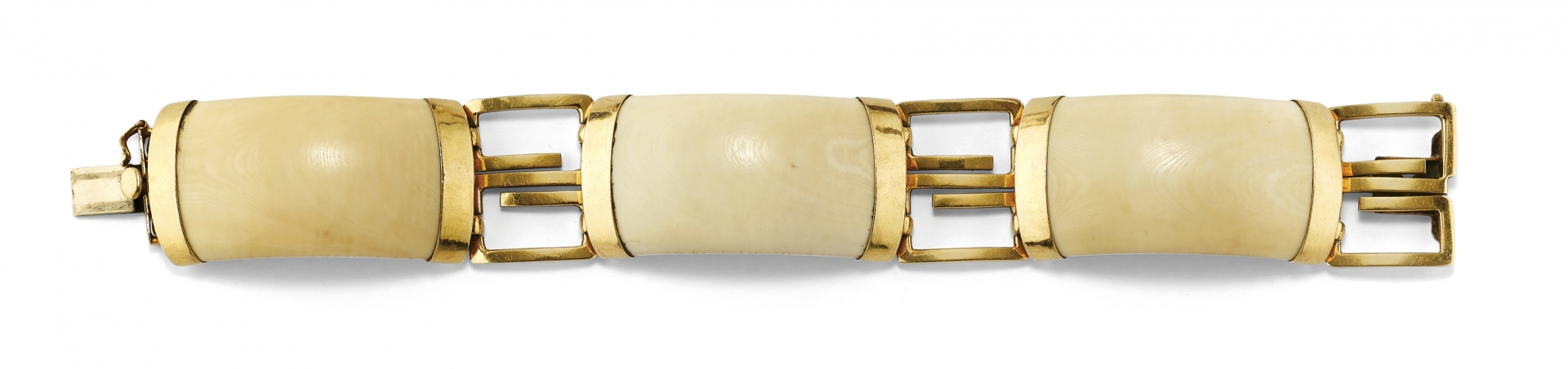 a maglie geometriche in oro giallo alternate a tre placche rettangolari in avorio. Circa 1970.