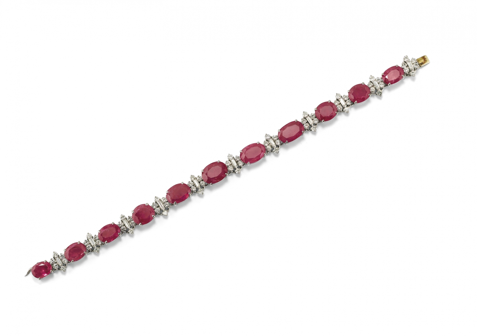 in oro bianco con rubini taglio ovale a scalare di ct 16,00 ca. intervallati da maglie in diamanti di ct 2,20 circa.